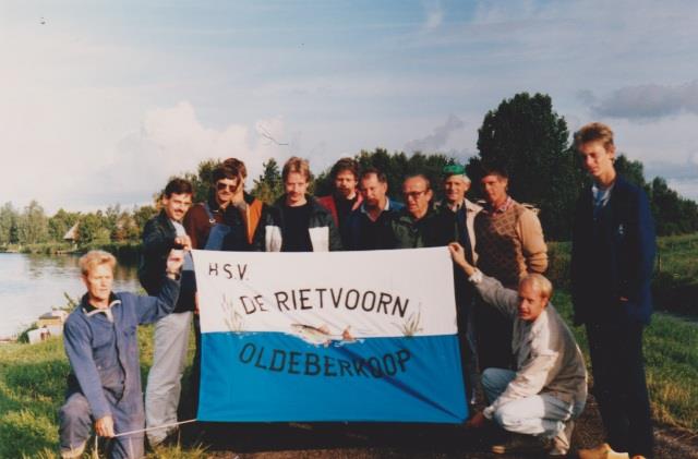 Hengelsport Vereniging de Rietvoorn Oldeberkoop ca. 1990, krijgt een vlag aangeboden