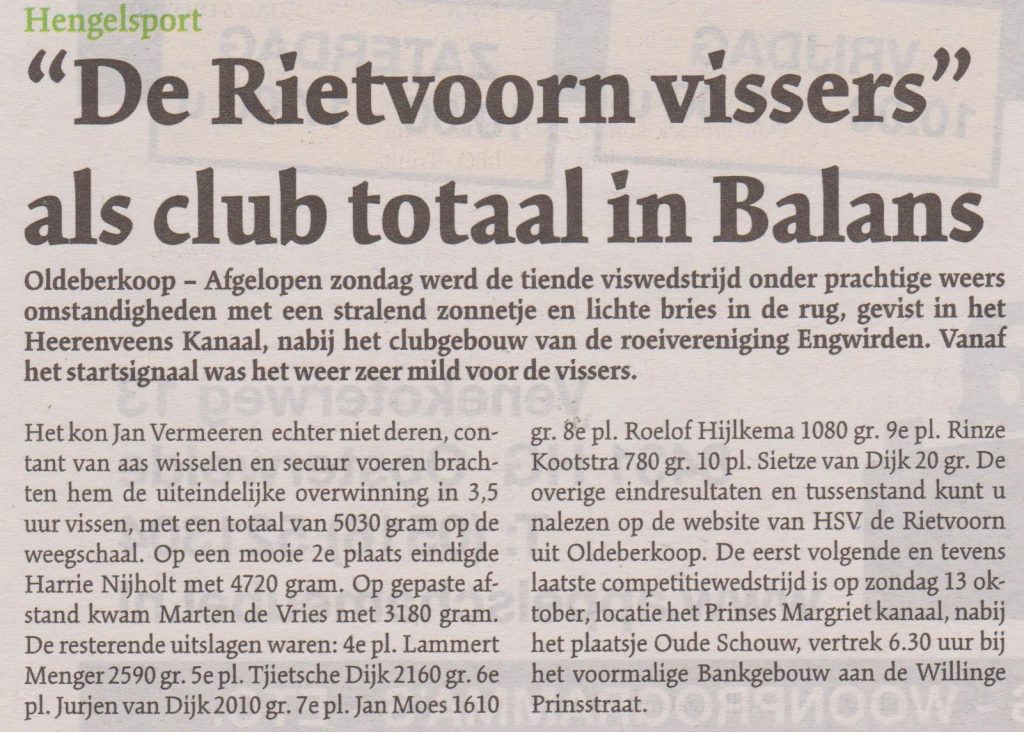 De 2e viswedstrijd van HSV de Rietvoorn werd afgelopen zondag ochtend in de Helomavaart gehouden. Ondanks de slechte weerberichten werd het een droge ochtend met weinig wind. De scheepvaart was na 9.00 uur lastig voor…