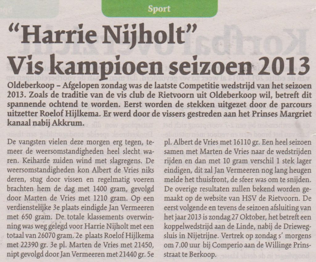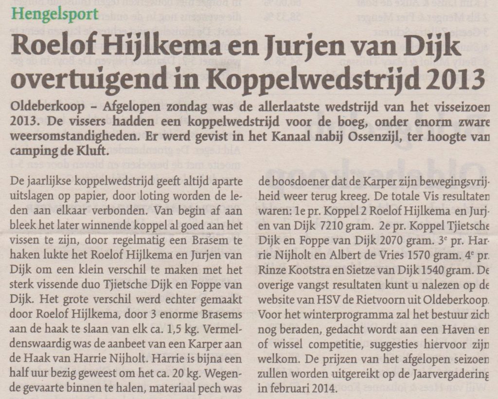 Oldeberkoop – Afgelopen zondag was er voor de jeugd van HSV de Rietvoorn en de jeugd van Oldeberkoop een viswedstrijd om de Meerholtbokaal 2013. Er werd gevist in 2 poules met voor elke groep leuke…