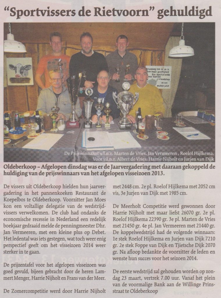 Oldeberkoop – Afgelopen dinsdag was er de Jaarvergadering met daaraan gekoppeld de huldiging van de prijswinnaars van het afgelopen visseizoen 2013. “ Sportvissers de Rietvoorn “ gehuldigd Oldeberkoop – Afgelopen dinsdag was er de Jaarvergadering…
