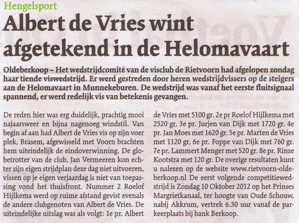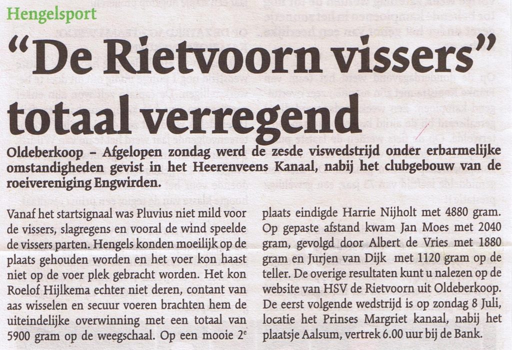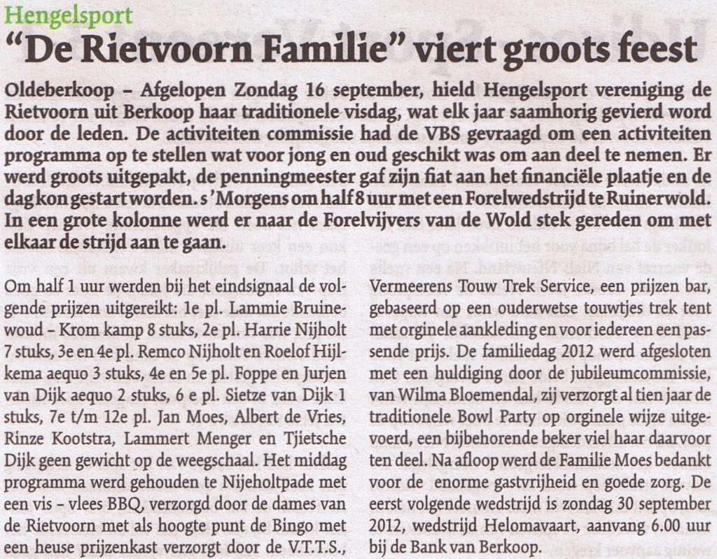 Oldeberkoop – Afgelopen weekend was er de finale van het visseizoen 2012. De hengelaars van HSV de Rietvoorn uit Oldeberkoop hadden hun laatste wedstrijd te vervissen aan het Prinses Margrietkanaal ter hoogte van Oudeschouw, nabij…