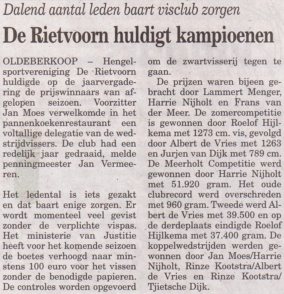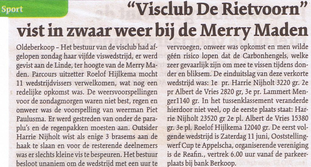 Oldeberkoop – Afgelopen zondag was er de opening van het visseizoen 2011. HSV de Rietvoorn uit Oldeberkoop hield haar eerste viswedstrijd. Er werd gestreden aan de Tjonger nabij Oldelamer. Bij aanvang melden 3 vissers af…