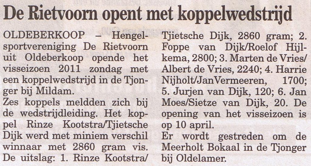 Oldeberkoop – Hengelsport vereniging de Rietvoorn hield afgelopen Zondag haar eerste wedstrijd van het visseizoen 2011. Het betrof een koppelwedstrijd. Er werd gestreden aan de boorden van de Kuunder, beter bekend als de Tjonger in…
