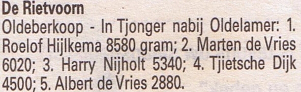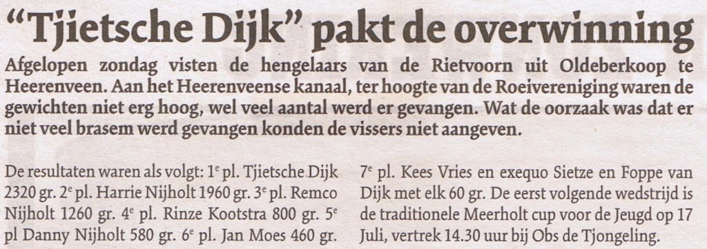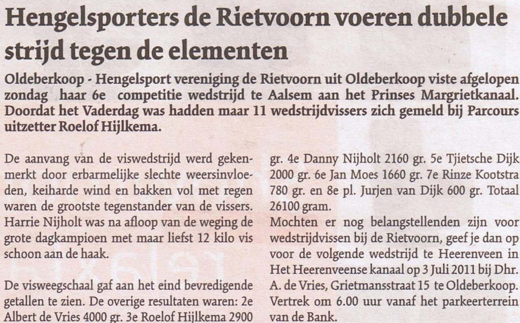 Oldeberkoop Hengelsport vereniging de Rietvoorn uit Oldeberkoop viste afgelopen zondag haar 6e competitie wedstrijd te Aalsem aan het Prinses Margrietkanaal. Door dat het Vaderdag was hadden zich maar 11 wedstrijdvissers zich gemeld bij Parcours uitzetter…