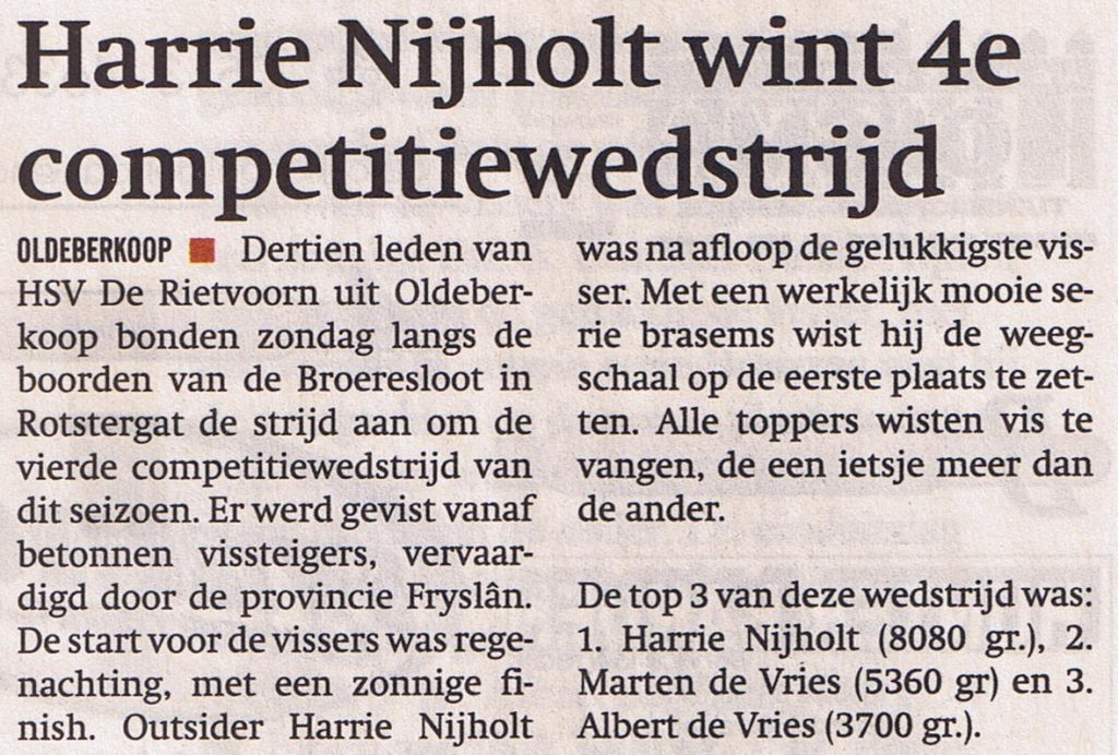 Oldeberkoop – Het bestuur van de vis club had afgelopen zondag haar vierde viswedstrijd, er werd gestreden aan de Broeresloot te Rotstergaast, bij velen meer bekend als de Vierhuistervaart. Parcours uitzetter Roelof Hijlkema mocht 13…