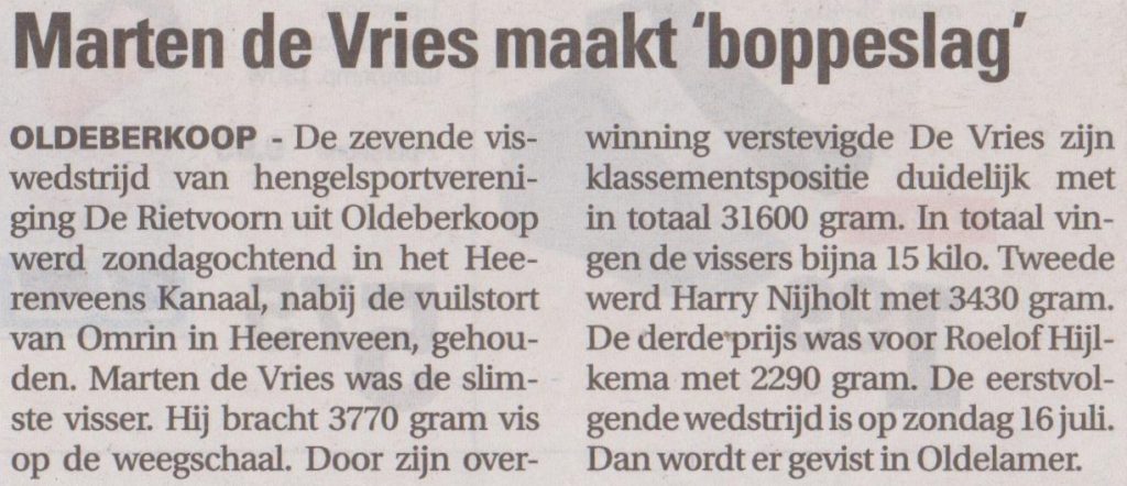 Oldeberkoop. De 7e viswedstrijd van HSV de Rietvoorn uit Oldeberkoop werd afgelopen zondag ochtend in het Heerenveens Kanaal, nabij de vuilstort van Omrin te Heerenveen gehouden. Ondanks de slechte weerberichten werd het een droge en…
