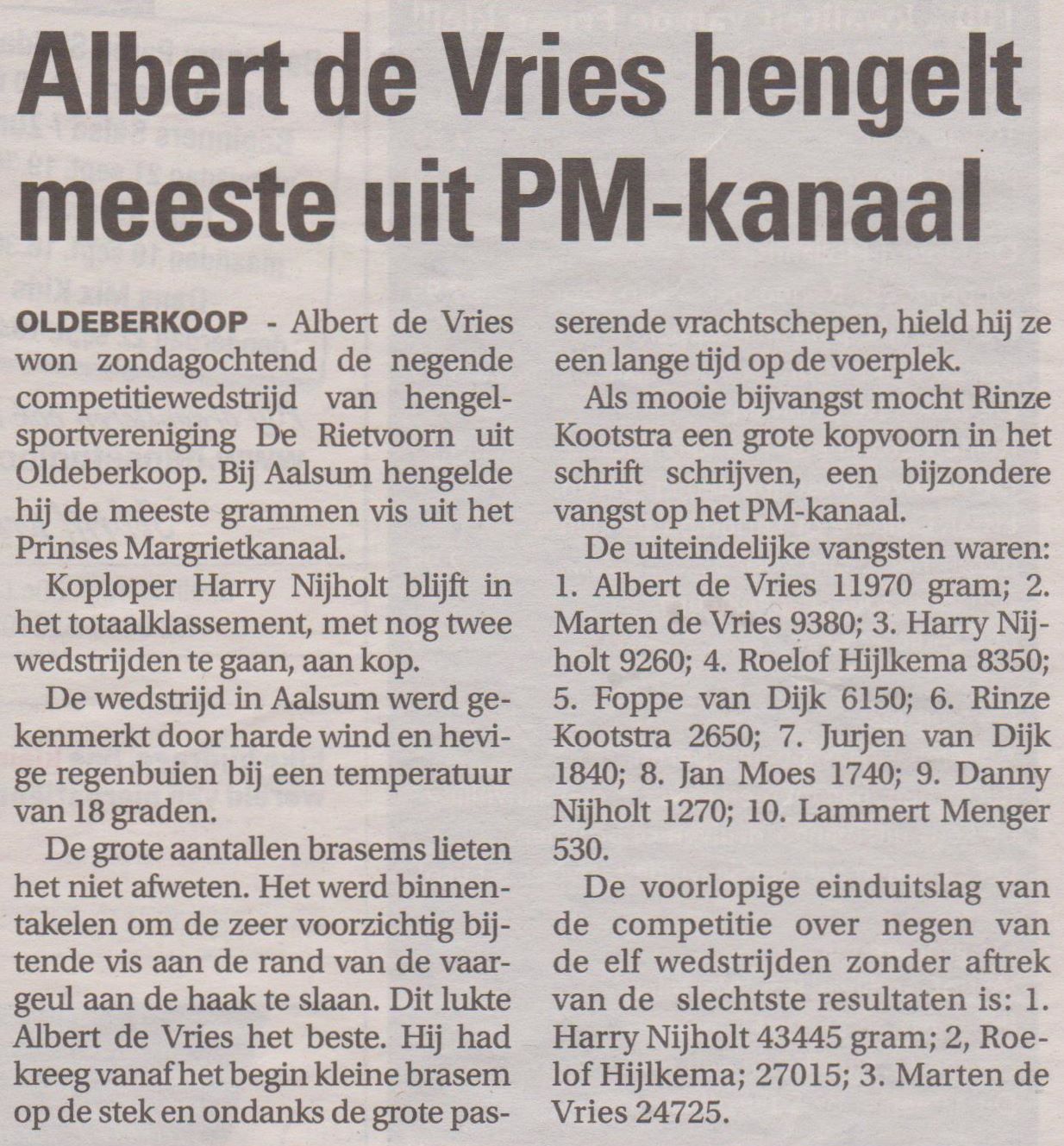 De grote aantallen Brasems lieten het deze keer niet afweten en werd op het PM Kanaal het gewicht door brasem bepaald en gevangen met een worm. Het werd binnen takelen om de zeer voorzichtig bijtende vis aan de rand van de vaargeul aan de haak te slaan. Dit lukte het beste bij Albert de Vries die vanaf het begin kleine brasem op de stek wist te krijgen en ondanks de grote passerende vrachtschepen een lange tijd op de voerplek wist te houden. Als mooie bijvangst mocht Rinze Kootstra een grote Kopvoorn in het schrift te schrijven een bijzondere vangst op het PM kanaal.