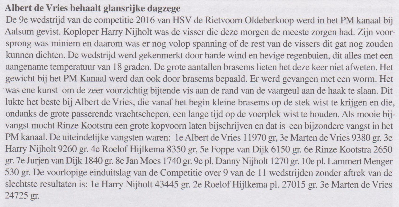 De uiteindelijke vangsten waren: 1e Albert de Vries 11970 gr, 3e Marten de Vries 9380 gr. 3e Harry Nijholt 9260 gr. 4e Roelof Hijlkema 8350 gr, 5e Foppe van Dijk 6150 gr. 6e Rinze Kootstra 2650 gr. 7e Jurjen van Dijk 1840 gr. 8e Jan Moes 1740 gr. 9e pl. Danny Nijholt 1270 gr. 10e pl. Lammert Menger 530 gr. De voorlopige einduitslag van de Competitie over 9 van de 11 wedstrijden zonder aftrek van de slechtste resultaten is: 1e Harry Nijholt 43445 gr. 2e Roelof Hijlkema pl. 27015 gr. 3e Marten de Vries 24725 gr. De eerstvolgende wedstrijdis18 September, vertrek 6 uur Carpoolplaats Oldeberkoop.