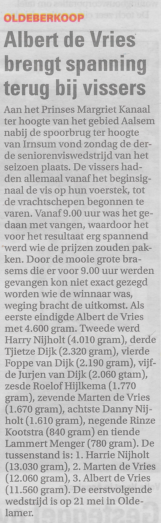 Op de eerste plaats eindigde Albert de Vries met 4600 gr. op de 2e pl. Harry Nijholt met 4010 gr., 3e pl. Tjietze Dijk met 2320 gr. 4e pl. Foppe van Dijk met 2190 gr. 5e pl. Jurjen van Dijk 2060 met 2060 gr. 6e pl. Roelof Hijlkema met 1770 gr. 7e pl. Marten de Vries 1670 gr. 8e pl. Danny Nijholt 1610 gr. 9e pl. Rinze Kootstra 840 gr. 10e pl. Lammert Menger 780 gr.