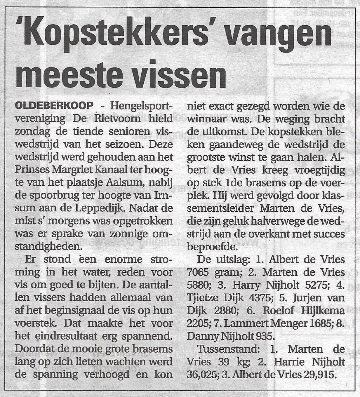 Er stond een enorme stroming in het water, reden voor vis om goed te bijten. De aantallen vissers hadden allemaal van af het beginsignaal de vis op hun voerstek, welke het voor het eindresultaat erg spannend ging maken. Doordat de mooie grote brasems lang op zich lieten wachten werd de spanning verhoogd en kon niet exact gezegd worden wie de winnaar was, weging bracht de uitkomst. De kopstekken bleken gaande weg de wedstrijd de grootste winst te gaan halen, Albert de Vries wist vroegtijdig op stek 1. de Brasems op de voerplek te krijgen gevold door klassementsleider Marten de Vries, wie zijn geluk halverwege de wedstrijd aan de overkant ging beproeven en met succes. Na de weging om half twaalf kon de balans worden opgemaakt.