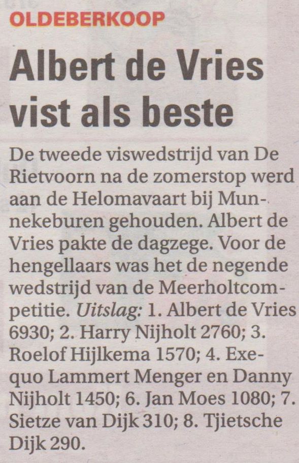 Voor de hengellaars was het de 9e wedstrijd van de Meerholt competitie. Het weer was onstuimig, harde wind en bakken met regen uit Noordwestelijke richting van de Helomavaart. Het deelnemers veld moest echter strijden tegen elkaar maar ook tegen de elementen van moeder natuur. Vooral het materiaal moest het ontgelden, snoeren kapot, paraplu’s dubbel en hoog water om de deelnemers heen. Er werd gevist vanaf de steigers, door de vele regen moesten de deelnemers al wadend door het water om hun plek te bereiken. Dit onstuimige weer, was het weer voor de winkle pickers, welke dan ook veelvuldig door de heren vissers werden opgetuigd. Het eindresultaat van de wedstrijd luidt: 1e pl. Albert de Vries 6930 gr. 2e pl. Harry Nijholt 2760 gr. 3e pl. Roelof Hijlkema 1570 gr. 4e pl. Exequo Lammert Menger en Danny Nijholt 1450 gr. 5e pl. Jan Moes 1080 gr. 6e pl. Jurjen van Dijk 540 gr. 7e pl. Sietze van Dijk 310 gr. 8e pl. Tjietsche Dijk 290 gr. De tussenstand kan worden nagelezen op de website van HSV de Rietvoorn. De volgende wedstrijd van HSV de Rietvoorn vindt plaats op 20 september in het nieuwe kanaal bij Heerenveen.