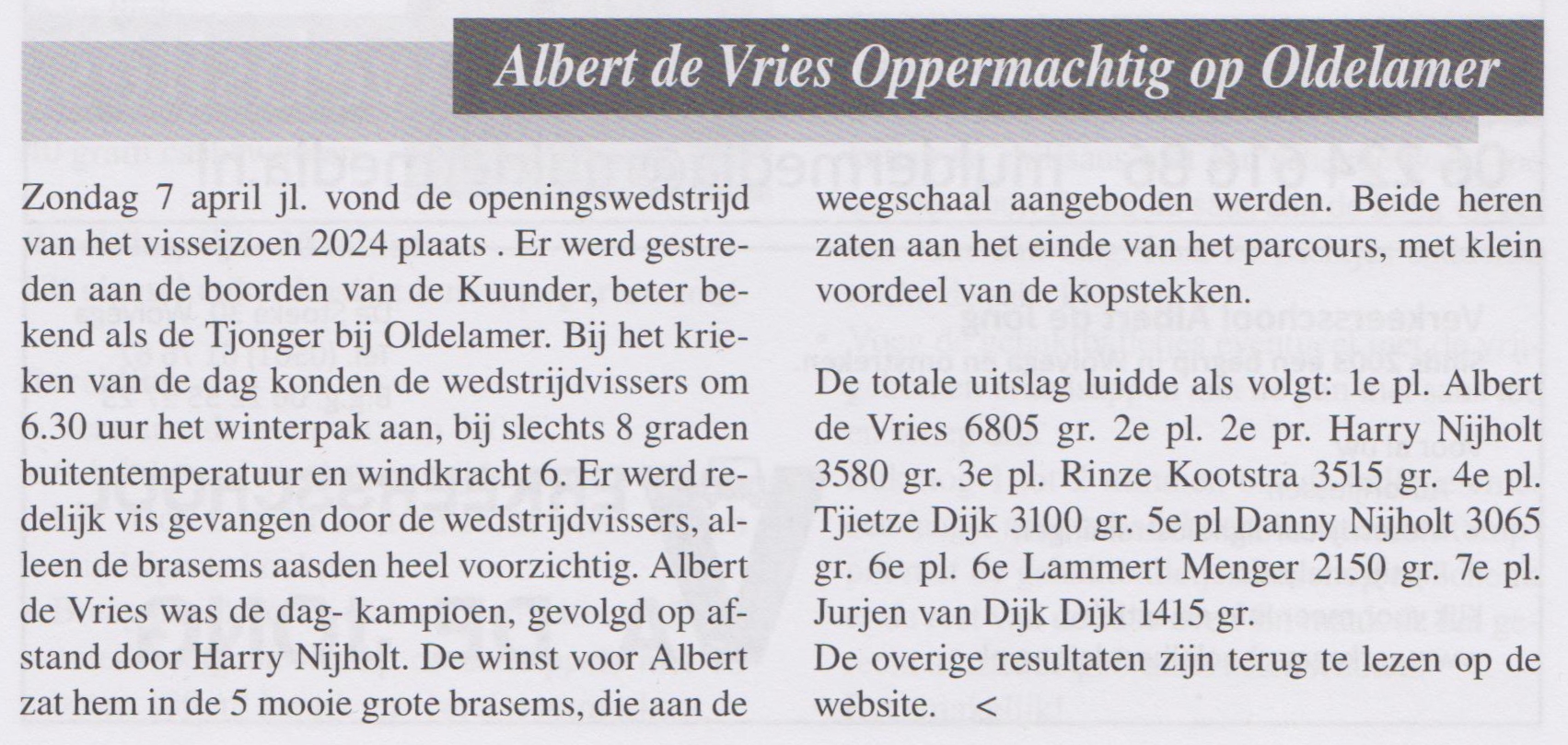 Er werd redelijk vis gevangen door de heren wedstrijdvissers, alleen de Brasems aasden heel voorzichtig. Albert de Vries was de dagkampioen gevolgd op afstand door Harry Nijholt, de winst voor Albert zat hem in de 5 mooie grote Brasems, welke aangeboden werden aan de weegschaal. Beide heren zaten op het einde van het parcours, met klein voordeel van de kopstekken.
