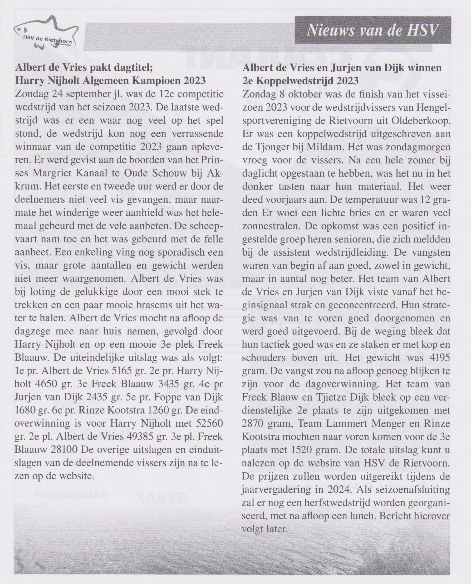 Het eerste en tweede uur werd er door de deelnemers niet veel vis gevangen, maar naarmate het winderige weer aanhield was het helemaal gebeurd met de vele aanbeten, de scheepvaart nam toe en het was gebeurd met felle aanbeet. Een enkeling ving nog sporadisch een vis, maar grote aantallen en gewicht werden niet meer waargenomen. Albert de Vries was bij loting de gelukkige, door een mooi stek te trekken en een paar mooie Brasems uit het water te halen. Albert de Vries mocht naafloop de dagzege mee naar huis nemen, gevolgd door Harry Nijholt en op een mooie 3e stek Freek Blaauw. De uiteindelijke uitslag was als volgt: 1e pr. Albert de Vries 5165 gr. 2e pr. Harry Nijholt 4650 gr. 3e Freek Blaauw 3435 gr. 4e pr Jurjen van Dijk 2435 gr. 5e pr. Foppe van Dijk 1680 gr. 6e pr. Rinze Kootstra 1260 gr. De eindoverwinning is voor Harry Nijholt met 52560 gr. 2e pl. Albert de Vries 49385 gr. 3e pl. Freek Blaauw 28100 De overige uitslagen en einduitslagen van de deelnemende vissers zijn na te lezen op de website. De eerst volgende activiteit is de koppelwedstrijd op 8 oktober 2023, vertrek 7.00 uur vanaf de Carpool in Oldeberkoop.