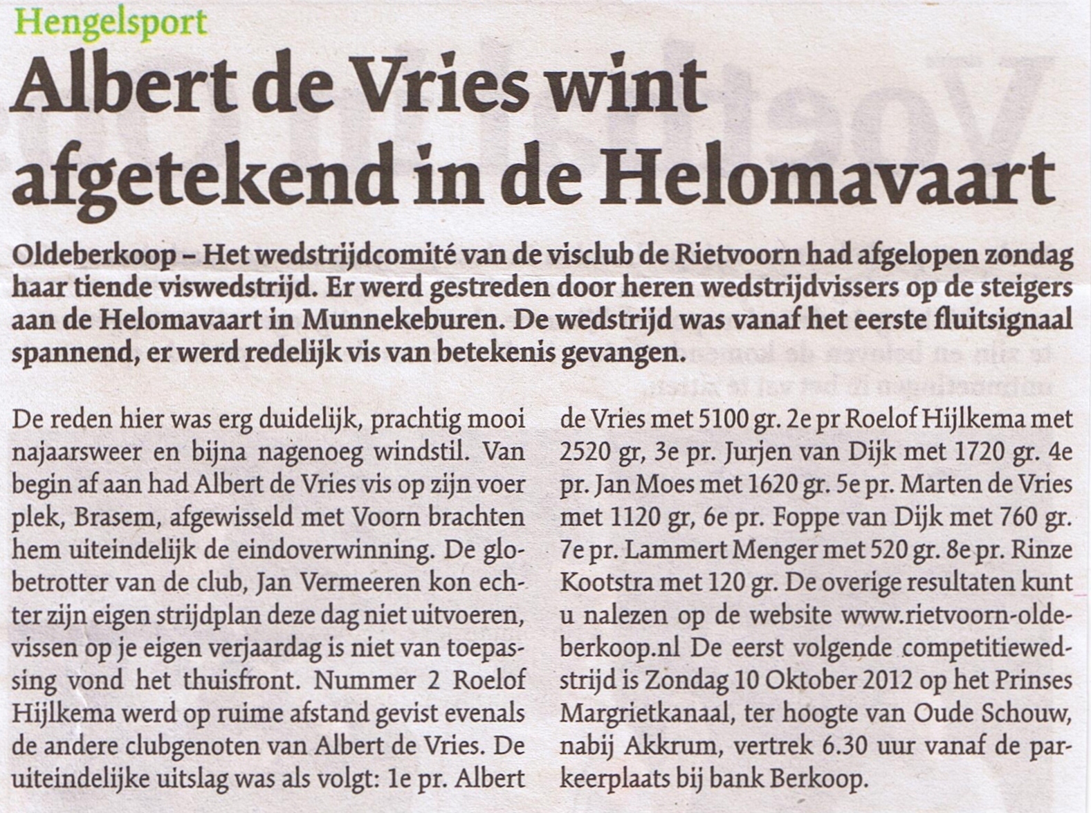 De wedstrijd was vanaf het eerste fluitsignaal spannend, er werd redelijk vis van betekenis gevangen. De reden hier was erg duidelijk, prachtig mooi najaarsweer en bijna nagenoeg windstil. Van begin af aan had Albert de Vries vis op zijn voer plek, Brasem, afgewisseld met Voorn brachten hem uiteindelijk de eindoverwinning. De globetrotter van de club, Jan Vermeeren kon echter zijn eigen strijdplan deze dag niet uitvoeren, vissen op je eigen verjaardag is niet van toepassing vond het thuisfront. Nummer 2 Roelof Hijlkema werd op ruime afstand gevist evenals de andere clubgenoten van Albert de Vries. De uiteindelijke uitslag was als volgt: 1e pr. Albert de Vries met 5100 gr. 2e pr Roelof Hijlkema met 2520 gr, 3e pr. Jurjen van Dijk met 1720 gr. 4e pr. Jan Moes met 1620 gr. 5e pr. Marten de Vries met 1120 gr, 6e pr. Foppe van Dijk met 760 gr. 7e pr. Lammert Menger met 520 gr. 8e pr. Rinze Kootstra met 120 gr. De overige resultaten kunt u nalezen op de website www.rietvoorn-oldeberkoop.nl De eerst volgende competitiewedstrijd is Zondag 10 Oktober 2012 op het Prinses Margrietkanaal, ter hoogte van Oude Schouw, nabij Akkrum, vertrek 6.30 uur vanaf de parkeerplaats bij bank Berkoop.