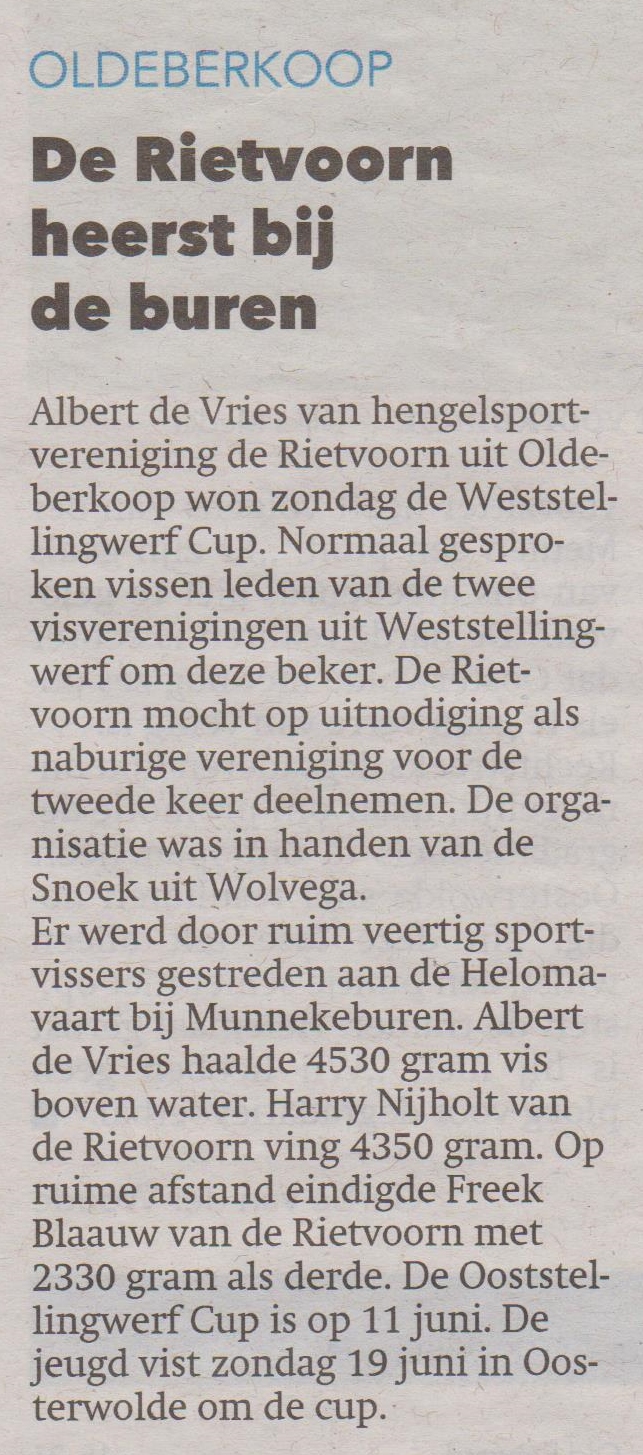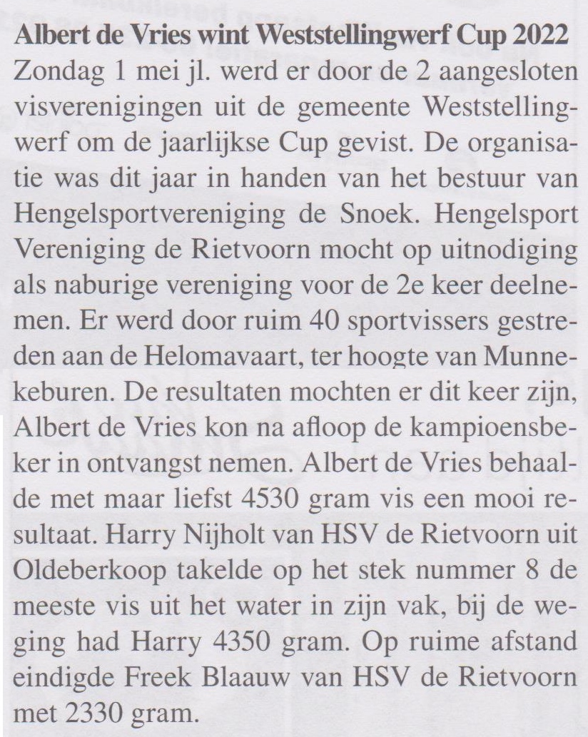 De resultaten mochten er dit keer zijn, Albert de Vries mocht na afloop de Kampioensbeker in ontvangst nemen. Albert de Vries behaalde met maar liefst 4530 gram vis een mooi resultaat. Harry Nijholt van HSV de Rietvoorn uit Oldeberkoop takelde op het stek nummer 8 de meeste vis uit het water in zijn vak, bij de weging had Harry 4350 gram. Op ruime afstand eindigde Freek Blaauw van HSV de Rietvoorn met 2330 gram. De Ooststellingwerf Cup senioren 2022 zal gehouden worden op 11 Juni 2022, voor de Jeugd wordt de Oostellingwerf Cup na 2 jaar Corona stop gehouden op zondag 19 Juni 2022 in Oosterwolde.