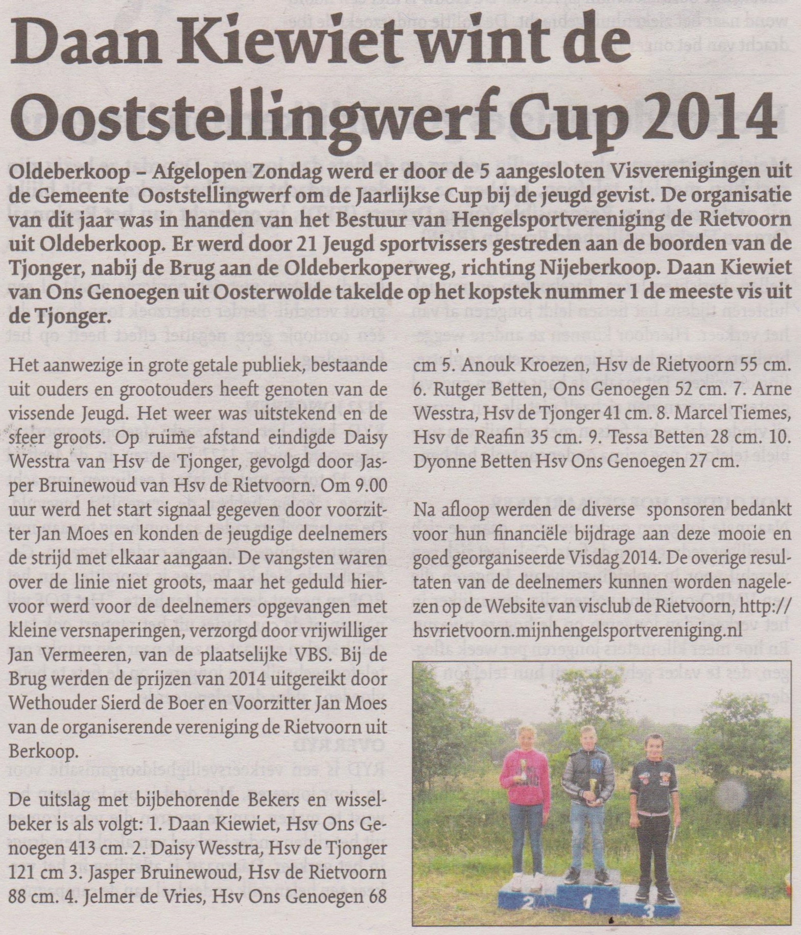 Er werd door 21 Jeugd sportvissers gestreden aan de boorden van de Tjonger, nabij de Brug aan de Oldeberkoperweg, richting Nijeberkoop. Daan Kiewiet van Ons Genoegen uit Oosterwolde takelde op het kopstek nummer 1 de meeste vis uit de Tjonger. Het aanwezige in grote getale publiek, bestaande uit ouders en grootouders heeft genoten van de vissende Jeugd. Het weer was uitstekend en de sfeer groots. Op ruime afstand eindigde Daisy Wesstra van Hsv de Tjonger, gevolgd door Jasper Bruinewoud van Hsv de Rietvoorn. Om 9.00 uur werd het start signaal gegeven door voorzitter Jan Moes en konden de jeugdige deelnemers de strijd met elkaar aangaan. De vangsten waren over de linie niet groots, maar het geduld hiervoor werd voor de deelnemers opgevangen met kleine versnaperingen, verzorgd door vrijwilliger Jan Vermeeren, van de plaatselijke VBS. Bij de Brug werden de prijzen van 2014 uitgereikt door Wethouder Sierd de Boer en Voorzitter Jan Moes van de organiserende vereniging de Rietvoorn uit Berkoop. De uitslag met bijbehorende Bekers is als volgt: 1. Daan Kiewiet, Hsv Ons Genoegen 413 cm. 2. Daisy Wesstra, Hsv de Tjonger 121 cm 3. Jasper Bruinewoud, Hsv de Rietvoorn 88 cm. 4. Jelmer de Vries, Hsv Ons Genoegen 68 cm 5. Anouk Kroezen, Hsv de Rietvoorn 55 cm. 6. Rutger Betten, Ons Genoegen 52 cm. 7. Arne Wesstra, Hsv de Tjonger 41 cm. 8. Marcel Tiemes, Hsv de Reafin 35 cm. 9. Tessa Betten 28 cm. 10. Dyonne Betten Hsv Ons Genoegen 27 cm. Na afloop werden de diverse sponsoren bedankt voor hun financiële bijdrage aan deze mooie en goed georganiseerde Visdag 2014. De overige resultaten van de deelnemers kunnen worden nagelezen op de Website van visclub de Rietvoorn, http://hsvrietvoorn.mijnhengelsportvereniging.nl