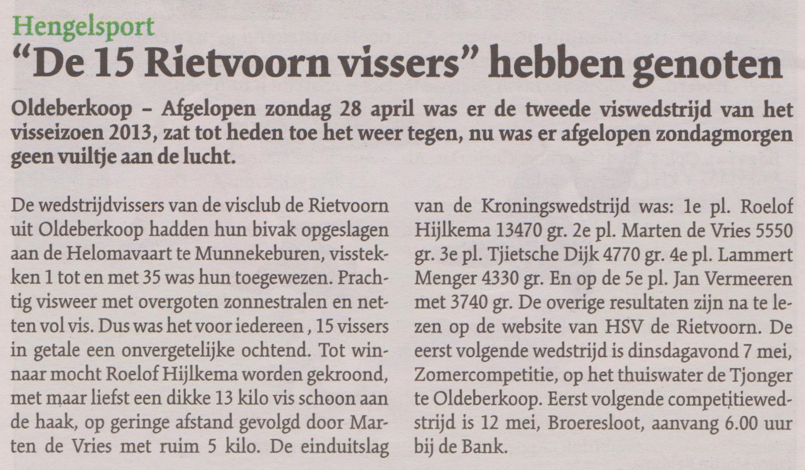 Prachtig visweer met overgoten zonnestralen en netten vol vis. Dus was het voor iedereen , 15 vissers in getale een onvergetelijke ochtend. Tot winnaar mocht Roelof Hijlkema worden gekroond, met maar liefst een dikke 13 kilo vis schoon aan de haak, op geringe afstand gevolgd door Marten de Vries met ruim 5 kilo. De einduitslag van de Kroningswedstrijd was: 1e pl. Roelof Hijlkema 13470 gr. 2e pl. Marten de Vries 5550 gr. 3e pl. Tjietsche Dijk 4770 gr. 4e pl. Lammert Menger 4330 gr. En op de 5e pl. Jan Vermeeren met 3740 gr. De overige resultaten zijn na te lezen op de website van HSV de Rietvoorn. De eerst volgende wedstrijd is dinsdagavond 7 mei, Zomercompetitie, op het thuiswater de Tjonger te Oldeberkoop. Eerst volgende competitiewedstrijd is 12 mei, Broeresloot, aanvang 6.00 uur bij de Bank.