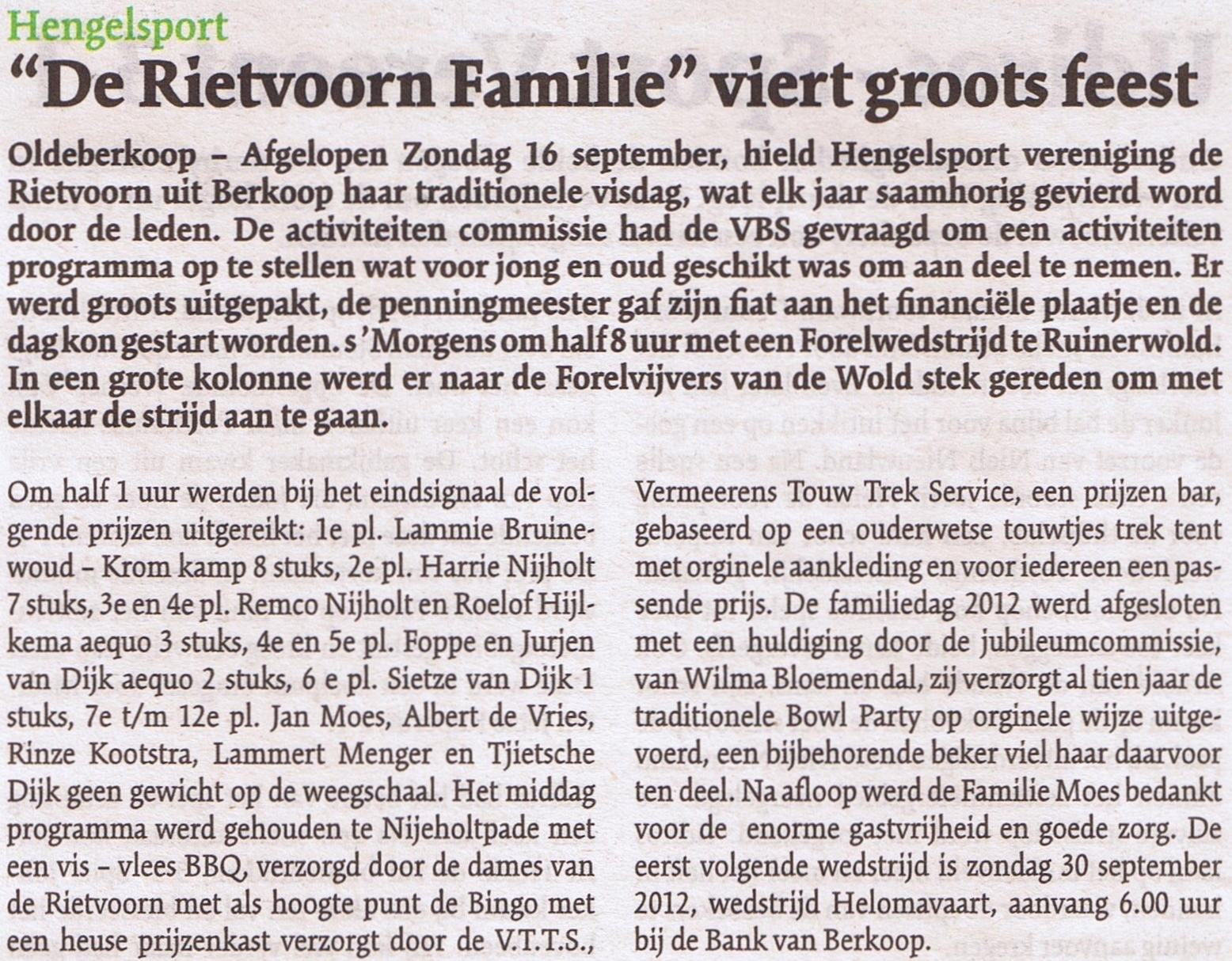 De activiteiten commissie had de VBS gevraagd om een activiteiten programma op te stellen wat voor jong en oud geschikt was om aan deel te nemen. Er werd groots uitgepakt, de penningmeester gaf zijn fiat aan het financiële plaatje en de dag kon gestart worden ’morgens 7.30 uur met een Forelwedstrijd te Ruinerwold. In een grote kolonne werd er naar de Forelvijvers van de Wold stek gereden om met elkaar de strijd aan te gaan. Om 12.30 uur werden bij het eindsignaal de volgende prijzen uitgereikt: 1e pl. Lammie Bruinewoud – Krom kamp 8 stuks, 2e pl. Harrie Nijholt 7 stuks, 3e en 4e pl. Remco Nijholt en Roelof Hijlkema aequo 3 stuks, 4e en 5e pl. Foppe en Jurjen van Dijk aequo 2 stuks, 6 e pl. Sietze van Dijk 1 stuks, 7e t/m 12e pl. Jan Moes, Albert de Vries, Rinze Kootstra, Lammert Menger en Tjietsche Dijk geen gewicht op de weegschaal. Het middag programma werd gehouden te Nijeholtpade met een vis – vlees BBQ, verzorgd door de dames van de Rietvoorn met als hoogte punt de Bingo met een heuse prijzen kast verzorgt door de V.T.T.S., Vermeerens Touw Trek Service, een prijzen bar, gebaseerd op een ouderwetse touwtjes trek tent met originele aankleding en voor iedereen een passende prijs. De familiedag 2012 werd afgesloten met een huldiging door de jubileumcommissie, van Wilma Bloemendal, zei verzorgt al tien jaar de traditionele Bowl Party op originele wijze uitgevoerd, een bijbehorende beker viel haar daarvoor ten deel. Na afloop werd de Familie Moes bedankt voor de enorme gastvrijheid en goede zorg. De eerst volgende wedstrijd is zondag 30 september 2012, wedstrijd Helomavaart, aanvang 6.00 uur bij de Bank van Berkoop.