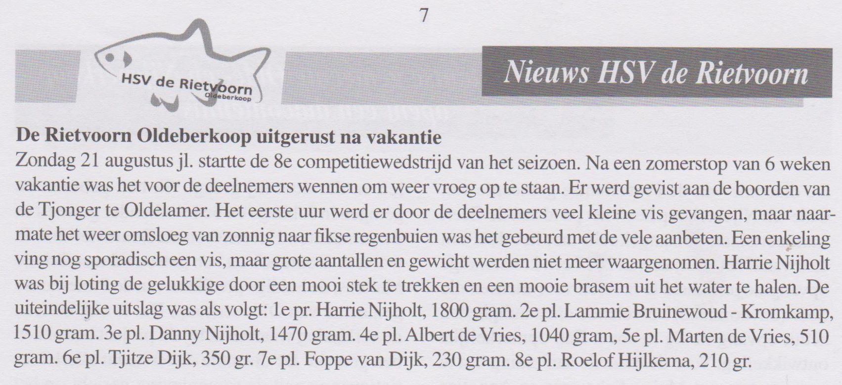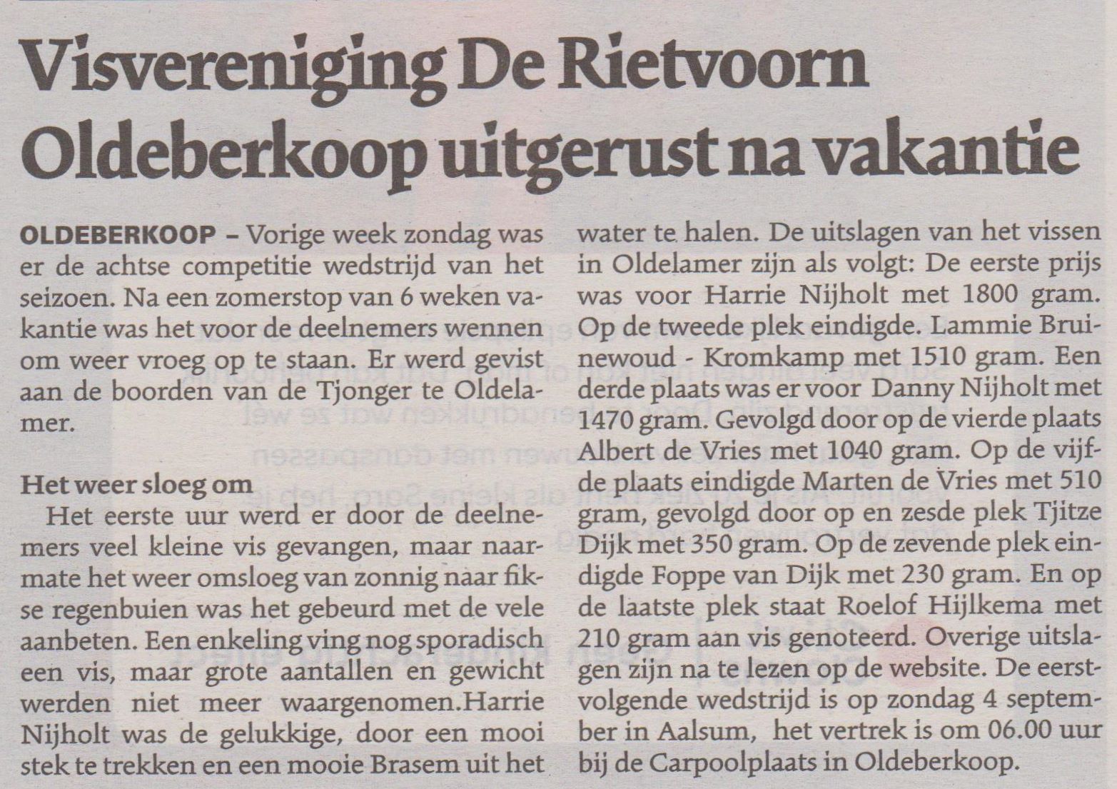 Een enkeling ving nog sporadisch een vis, maar grote aantallen en gewicht werden niet meer waargenomen. Harrie Nijholt was bij loting de gelukkige, door een mooi stek te trekken en een mooie Brasem uit het water te halen. De uiteindelijke uitslag was als volgt: 1e pr. Harrie Nijholt, 1800 gram. 2e pl. Lammie Bruinewoud – Kromkamp, 1510 gram. 3e pl. Danny Nijholt, 1470 gram. 4e pl. Albert de Vries, 1040 gram, 5e pl. Marten de Vries, 510 gram. 6e pl. Tjitze Dijk, 350 gr. 7e pl. Foppe van Dijk, 230 gram. 8e pl. Roelof Hijlkema, 210 gr. De overige uitslagen zijn na te lezen op de website.