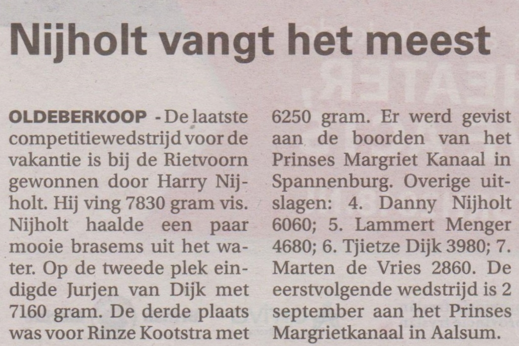 De uiteindelijke uitslag was als volgt: 1e pr. Harrie Nijholt, 7830 gram. 2e pl. Jurjen van Dijk, 7160 gram. 3e pl. Rinze Kootstra 6250 gram. 4e pl. Danny Nijholt, 6060 gram. 5e pl. Lammert Menger, 4680 gram, 6 Tjietze Dijk, 3980 gr. 7e pl. Marten de Vries, 2860 gram. De overige uitslagen zijn na te lezen op de website.