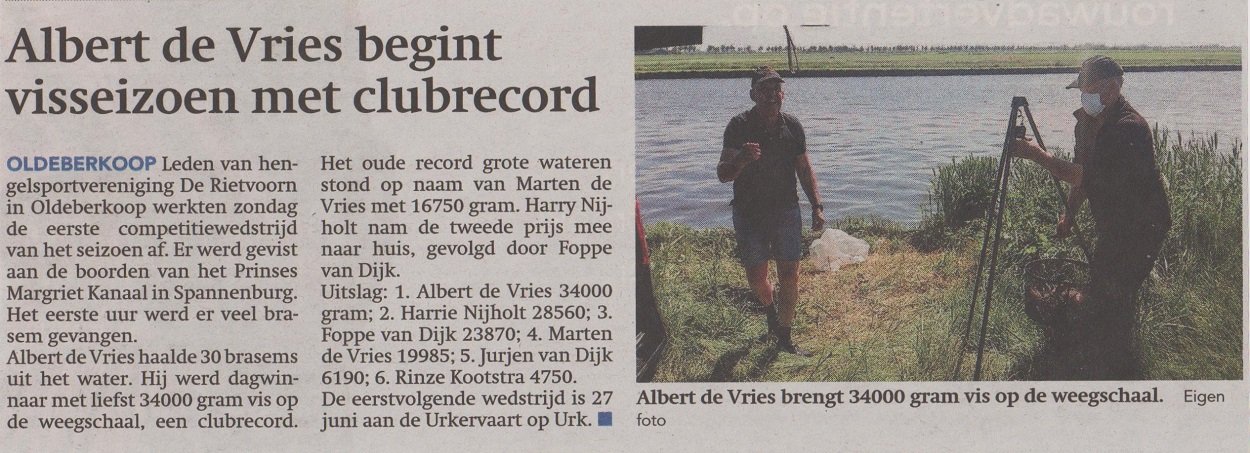 Het eerste uur werd er door de deelnemers veel Brasem gevangen. De wedstrijd mocht gevist worden met toestemming van Sportvisserij Fryslân. Er werd gevist door de leden met het door het RIVM opgestelde pakket Corona maatregelen. Albert de Vries was bij loting de gelukkige, door een mooie stek te trekken en heel veel mooie Brasems uit het water te halen, in totaal 30 stuks. Bij weging was Albert de Vries dagwinnaar met maar liefst 34000 gram vis op de weegschaal, een clubrecord. Het oude record grote wateren stond op naam van Marten de Vries met 16750 gram. Harry Nijholt mocht naafloop de 2e prijs mee naar huis nemen, gevolgd door Foppe van Dijk op een mooie 3e stek. De uiteindelijke uitslag was als volgt: 1e pr. Albert de Vries met 34000 gr. 2e pl. Harrie Nijholt, 28560 gram. 3e pl. Foppe van Dijk, 23870 gram. 4e pl. Marten de Vries 19985 gr. 5e pl. Jurjen van Dijk 6190 gr. 6e pl. Rinze Kootstra 4750 gram. De overige uitslagen zijn na te lezen op de website van de visclub. De eerst volgende wedstrijd is 27 Juni, Urkervaart, Urk, vertrek 6 uur bij de Carpool in Berkoop.
