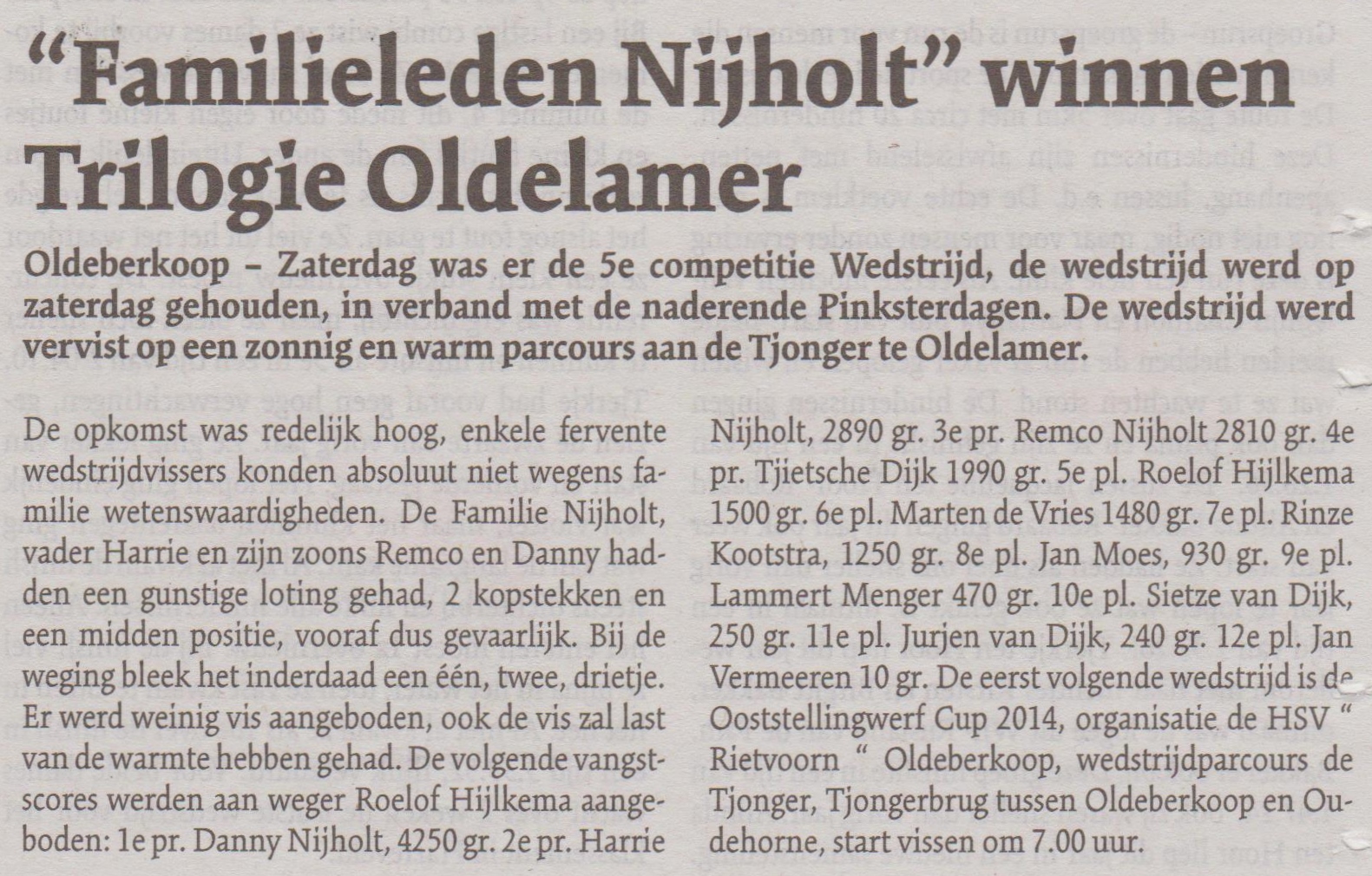De opkomst was redelijk hoog, enkele fervente wedstrijdvissers konden absoluut niet wegens familie wetenswaardigheden. De Familie Nijholt, vader Harrie en zijn zoons Remco en Danny hadden een gunstige loting gehad, 2 kopstekken en een midden positie, vooraf dus gevaarlijk. Bij de weging bleek het inderdaad een één, twee, drietje. Er werd weinig vis aangeboden, ook de vis zal last van de warmte hebben gehad. De volgende vangstscores werden aan weger Roelof Hijlkema aangeboden: 1e pr. Danny Nijholt, 4250 gr. 2e pr. Harrie Nijholt, 2890 gr. 3e pr. Remco Nijholt 2810 gr. 4e pr. Tjietsche Dijk 1990 gr. 5e pl. Roelof Hijlkema 1500 gr. 6e pl. Marten de Vries 1480 gr. 7e pl. Rinze Kootstra, 1250 gr. 8e pl. Jan Moes, 930 gr. 9e pl. Lammert Menger 470 gr. 10e pl. Sietze van Dijk, 250 gr. 11e pl. Jurjen van Dijk, 240 gr. 12e pl. Jan Vermeeren 10 gr. De eerst volgende wedstrijd is de Ooststellingwerf Cup 2014, organisatie de HSV “ Rietvoorn “ Oldeberkoop, wedstrijdparcours de Tjonger, Tjongerbrug tussen Oldeberkoop en Oudehorne, start vissen om 7.00 uur.