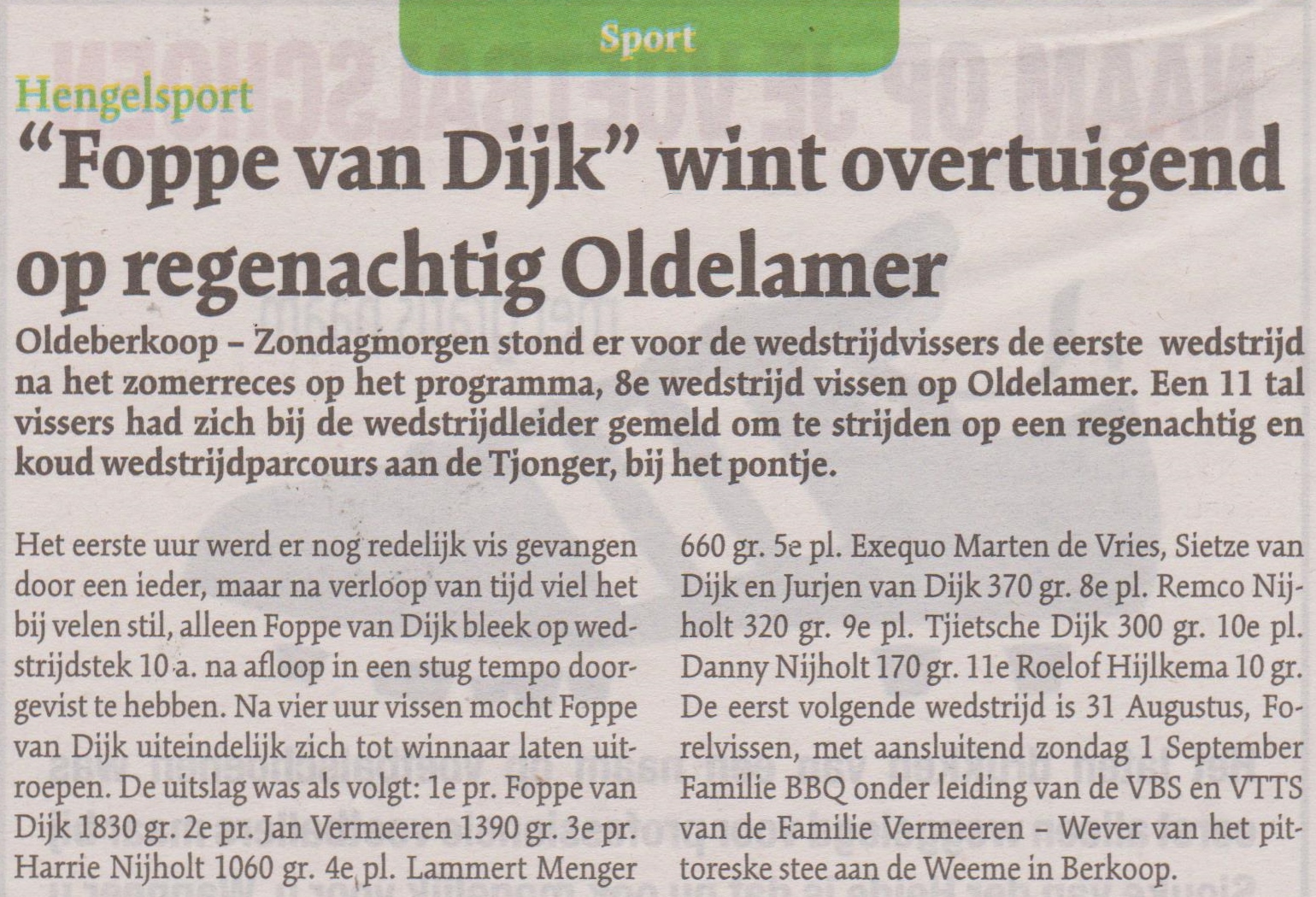 Een 11 tal vissers had zich bij de wedstrijdleider gemeld om te strijden op een regenachtig en koud wedstrijdparcours aan de Tjonger, bij het pontje. Het eerste uur werd er nog redelijk vis gevangen door een ieder, maar na verloop van tijd viel het bij velen stil, alleen Foppe van Dijk bleek op wedstrijdstek 10 a. na afloop in een stug tempo doorgevist te hebben. Na vier uur vissen mocht Foppe van Dijk uiteindelijk zich tot winnaar laten uitroepen. De uitslag was als volgt: 1e pr. Foppe van Dijk 1830 gr. 2e pr. Jan Vermeeren 1390 gr. 3e pr. Harrie Nijholt 1060 gr. 4e pl. Lammert Menger 660 gr. 5e pl. Exequo Marten de Vries, Sietze van Dijk en Jurjen van Dijk 370 gr. 8e pl. Remco Nijholt 320 gr. 9e pl. Tjietsche Dijk 300 gr. 10e pl. Danny Nijholt 170 gr. 11e Roelof Hijlkema 10 gr. De eerst volgende wedstrijd is 31 Augustus, Forelvissen, met aansluitend zondag 1 September Familie BBQ onder leiding van de VBS en VTTS van de Familie Vermeeren – Wever van het pittoreske stee aan de Weeme in Berkoop.