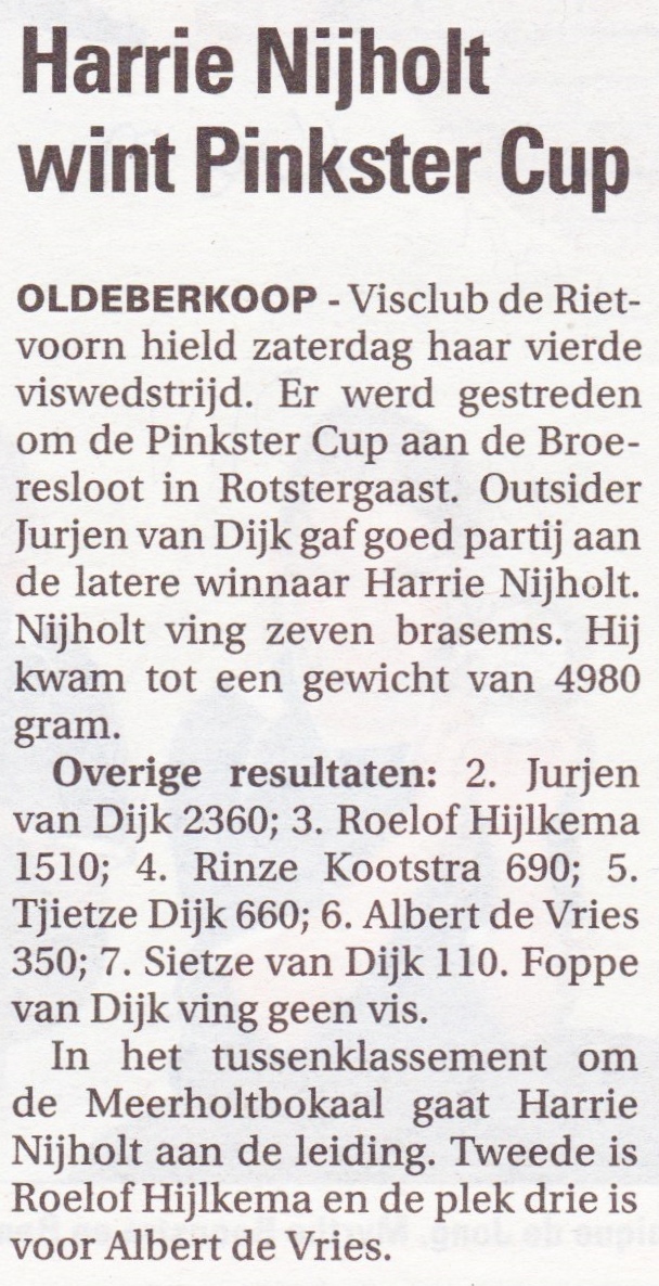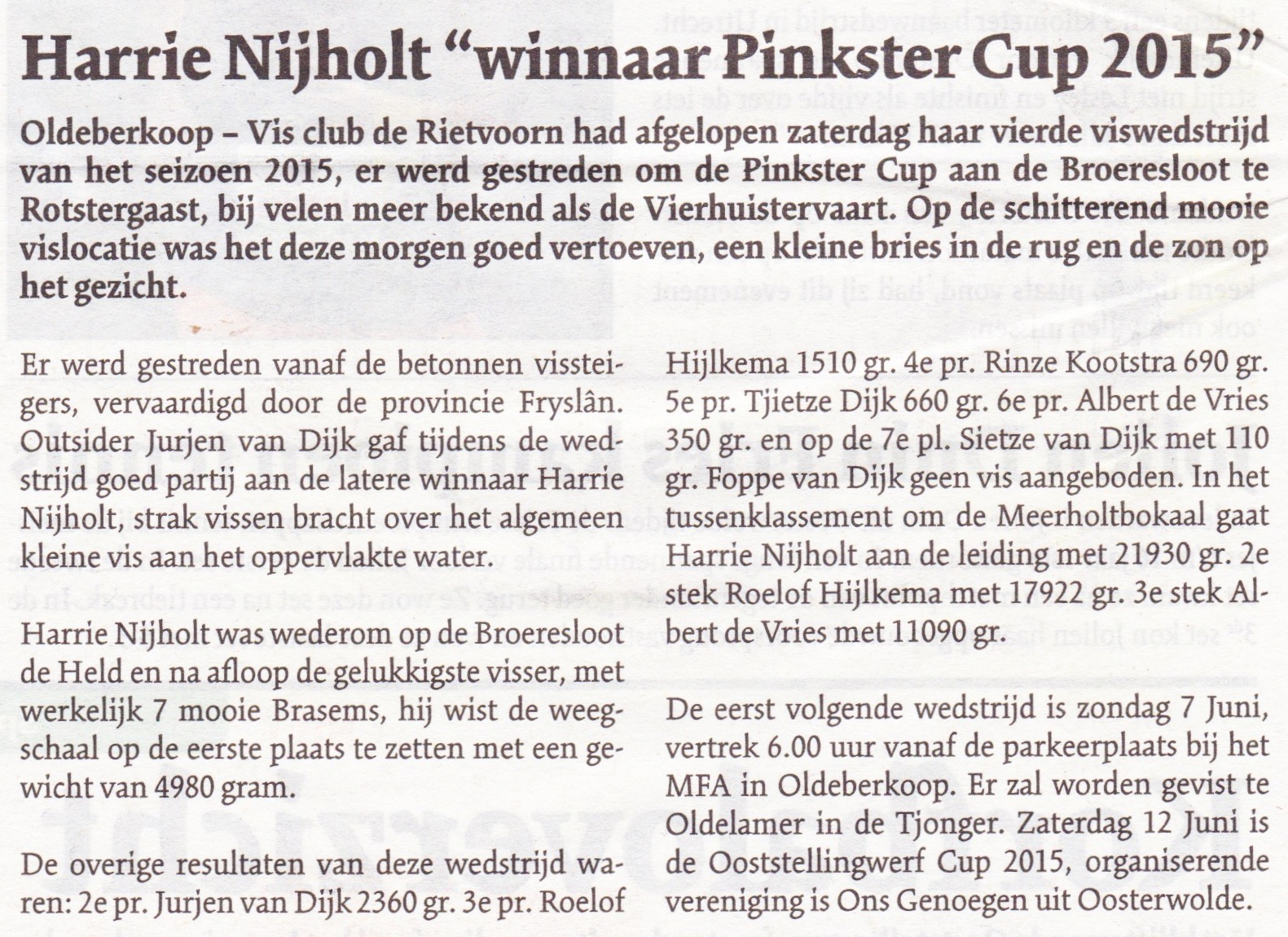 Op de schitterend mooie vislocatie was het deze morgen goed vertoeven, een kleine bries in de rug en de zon op het gezicht. Er werd gestreden vanaf de betonnen vissteigers, vervaardigd door de provincie Fryslân. Outsider Jurjen van Dijk gaf tijdens de wedstrijd goed partij aan de latere winnaar Harrie Nijholt, strak vissen bracht over het algemeen kleine vis aan het oppervlakte water. Harrie Nijholt was wederom op de Broeresloot de Held en na afloop de gelukkigste visser, met werkelijk 7 mooie Brasems, hij wist de weegschaal op de eerste plaats te zetten met een gewicht van 4980 gram. De overige resultaten van deze wedstrijd waren: 2e pr. Jurjen van Dijk 2360 gr. 3e pr. Roelof Hijlkema 1510 gr. 4e pr. Rinze Kootstra 690 gr. 5e pr. Tjietze Dijk 660 gr. 6e pr. Albert de Vries 350 gr. en op de 7e pl. Sietze van Dijk met 110 gr. Foppe van Dijk geen vis aangeboden. In het tussenklassement om de Meerholtbokaal gaat Harrie Nijholt aan de leiding met 21930 gr. 2e stek Roelof Hijlkema met 17922 gr. 3e stek Albert de Vries met 11090 gr. De eerst volgende wedstrijd is zondag 7 Juni, vertrek 6.00 uur vanaf de parkeerplaats bij het MFA in Oldeberkoop. Er zal worden gevist te Oldelamer in de Tjonger. Zaterdag 13 Juni is de Ooststellingwerf Cup 2015, organiserende vereniging is Ons Genoegen uit Oosterwolde.