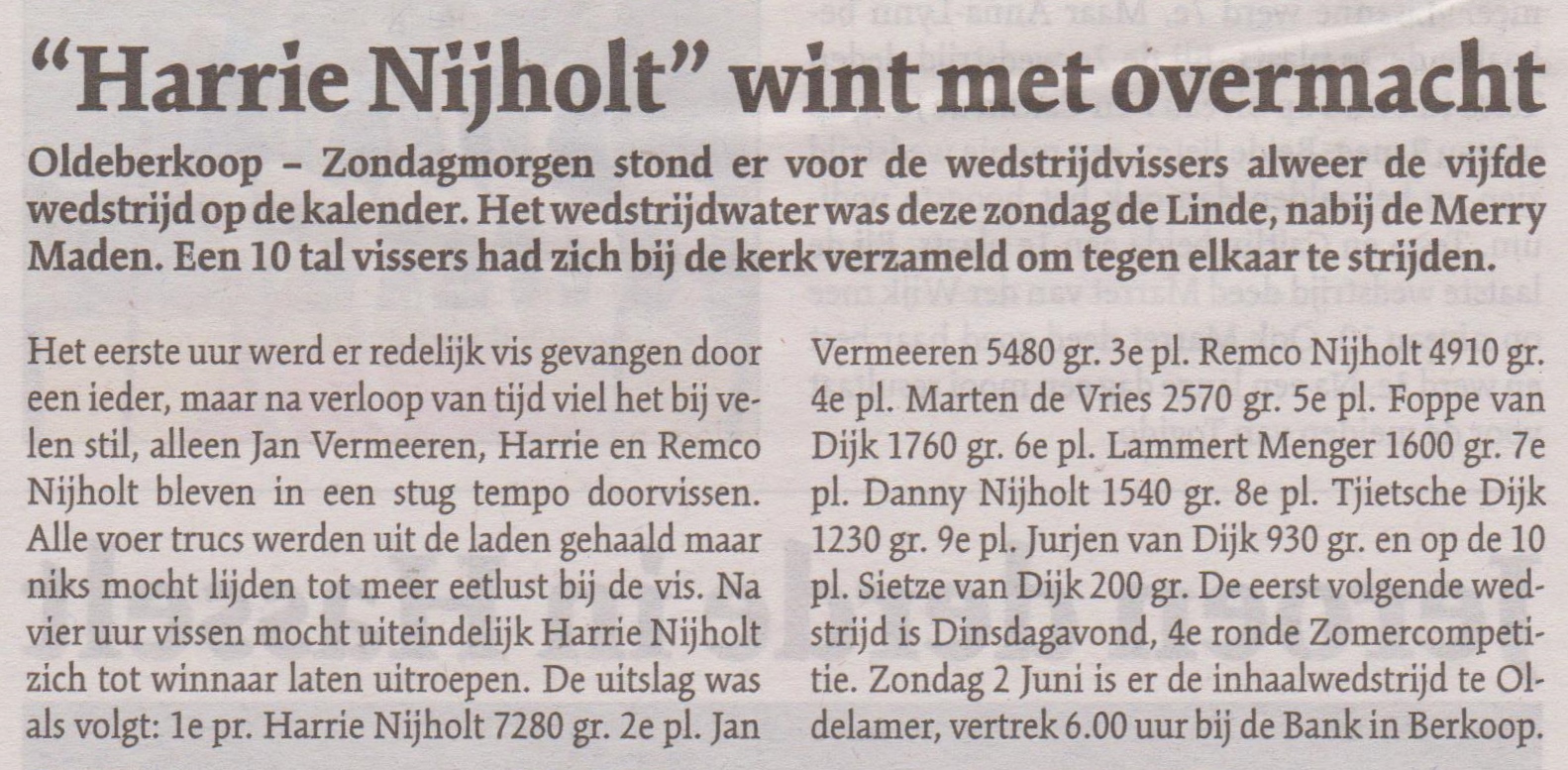 Een 10 tal vissers had zich bij de kerk verzameld om tegen elkaar te strijden. Het eerste uur werd er redelijk vis gevangen door een ieder, maar na verloop van tijd viel het bij velen stil, alleen Jan Vermeeren, Harrie en Remco Nijholt bleven in een stug tempo doorvissen. Alle voer trucs werden uit de laden gehaald maar niks mocht lijden tot meer eetlust bij de vis. Na vier uur vissen mocht uiteindelijk Harrie Nijholt zich tot winnaar laten uitroepen. De uitslag was als volgt: 1e pr. Harrie Nijholt 7280 gr. 2e pl. Jan Vermeeren 5480 gr. 3e pl. Remco Nijholt 4910 gr. 4e pl. Marten de Vries 2570 gr. 5e pl. Foppe van Dijk 1760 gr. 6e pl. Lammert Menger 1600 gr. 7e pl. Danny Nijholt 1540 gr. 8e pl. Tjietsche Dijk 1230 gr. 9e pl. Jurjen van Dijk 930 gr. en op de 10 pl. Sietze van Dijk 200 gr. De eerst volgende wedstrijd is Dinsdagavond, 4e ronde Zomercompetitie. Zondag 2 Juni is er de inhaalwedstrijd te Oldelamer, vertrek 6.00 uur bij de Bank in Berkoop.