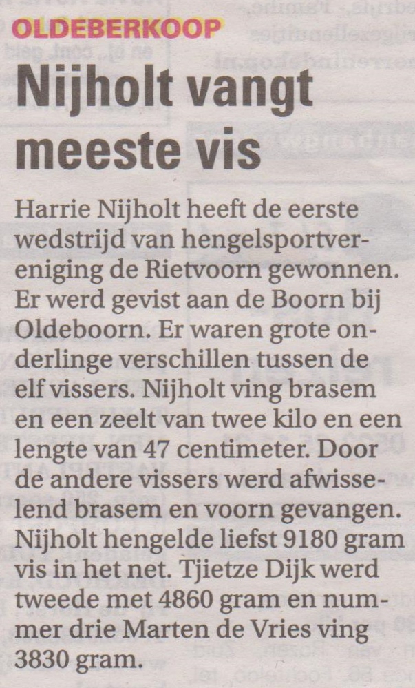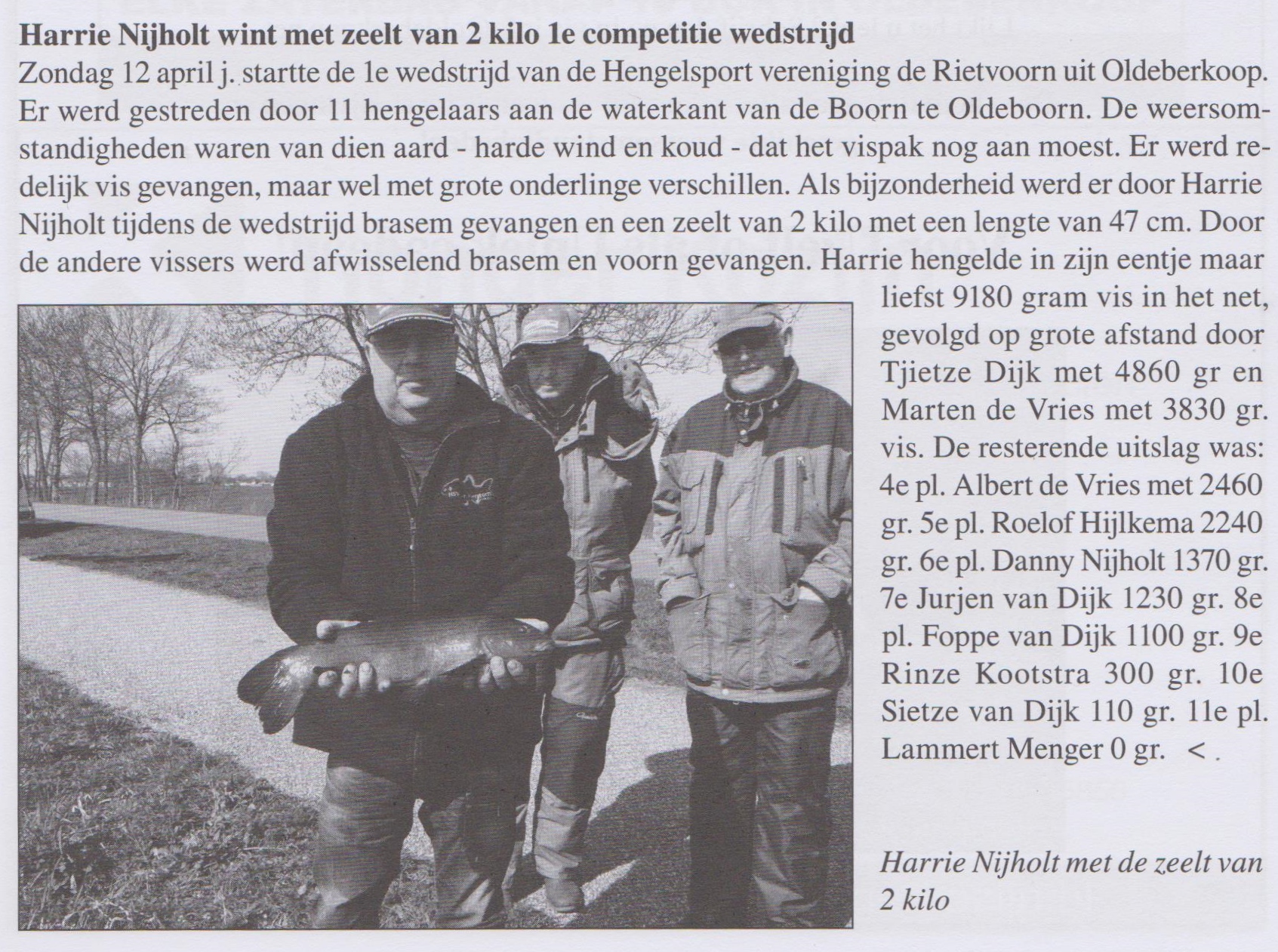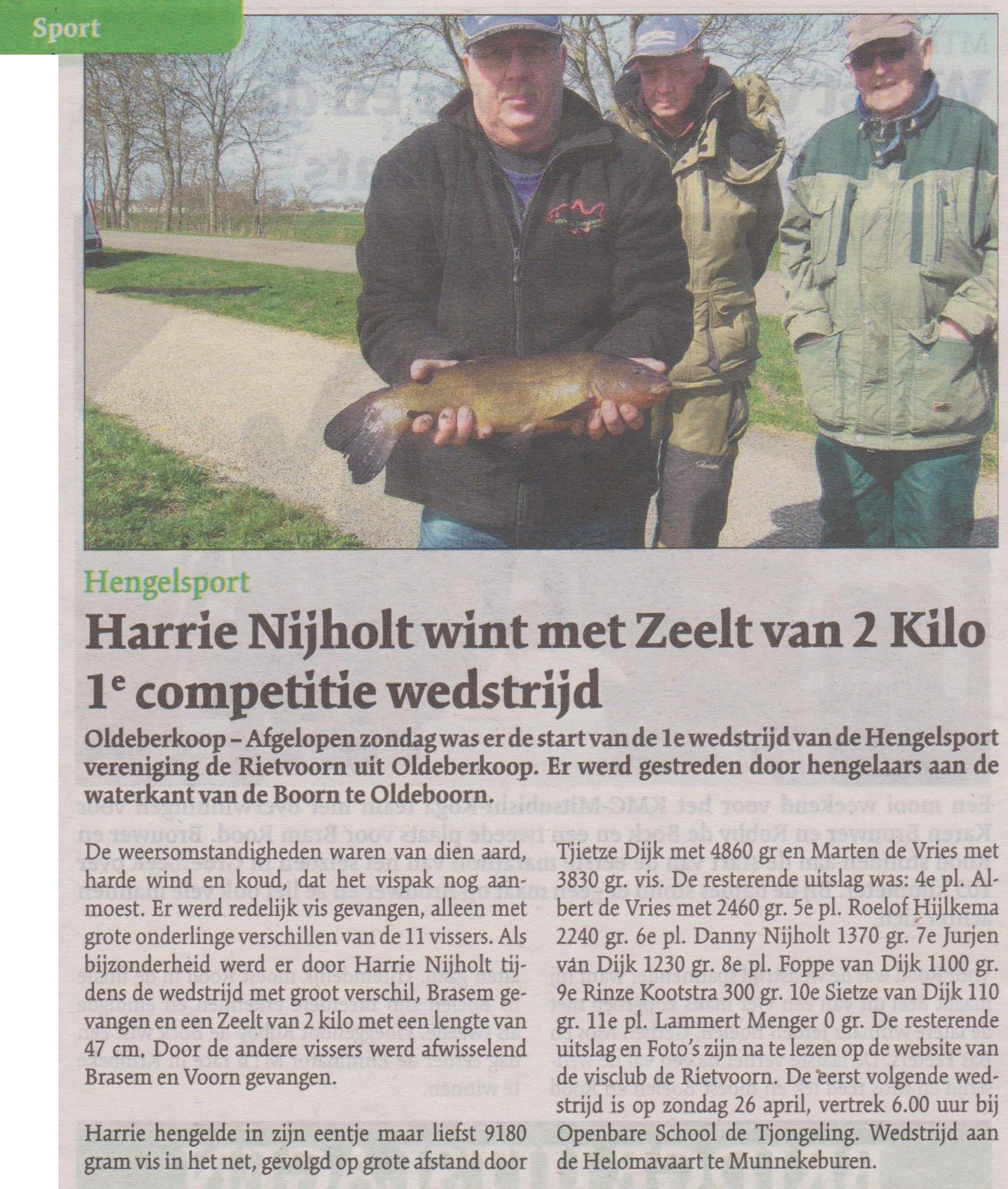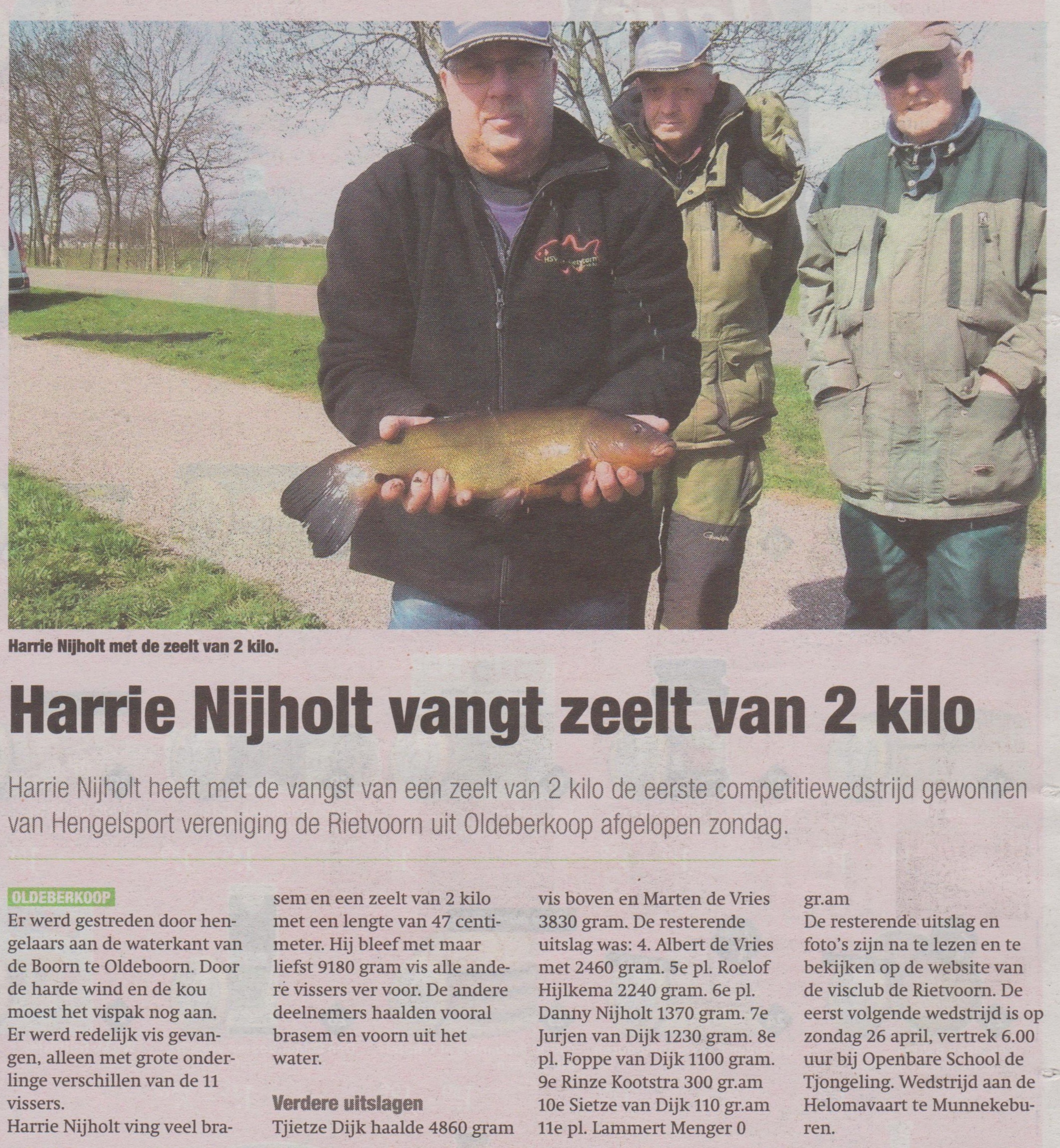 De weersomstandigheden waren van dien aard, harde wind en koud, dat het vispak nog aanmoest. Er werd redelijk vis gevangen, alleen met grote onderlinge verschillen van de 11 vissers. Als bijzonderheid werd er door Harrie Nijholt tijdens de wedstrijd met groot verschil, Brasem gevangen en een Zeelt van 2 kilo met een lengte van 47 cm. Door de andere vissers werd afwisselend Brasem en Voorn gevangen. Harrie hengelde in zijn eentje maar liefst 9180 gram vis in het net, gevolgd op grote afstand door Tjietze Dijk met 4860 gr en Marten de Vries met 3830 gr. vis. De resterende uitslag was: 4e pl. Albert de Vries met 2460 gr. 5e pl. Roelof Hijlkema 2240 gr. 6e pl. Danny Nijholt 1370 gr. 7e Jurjen van Dijk 1230 gr. 8e pl. Foppe van Dijk 1100 gr. 9e Rinze Kootstra 300 gr. 10e Sietze van Dijk 110 gr. 11e pl. Lammert Menger 0 gr. De resterende uitslag en Foto’s zijn na te lezen op de website van de visclub de Rietvoorn. De eerst volgende wedstrijd is op zondag 26 april, vertrek 6.00 uur bij Openbare School de Tjongeling. Wedstrijd aan de Helomavaart te Munnekeburen.