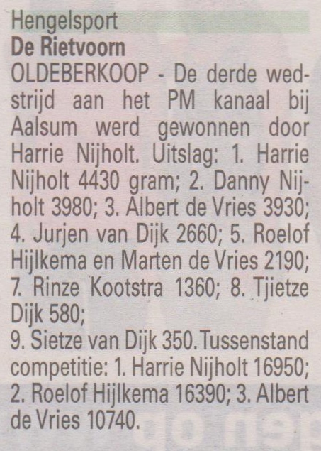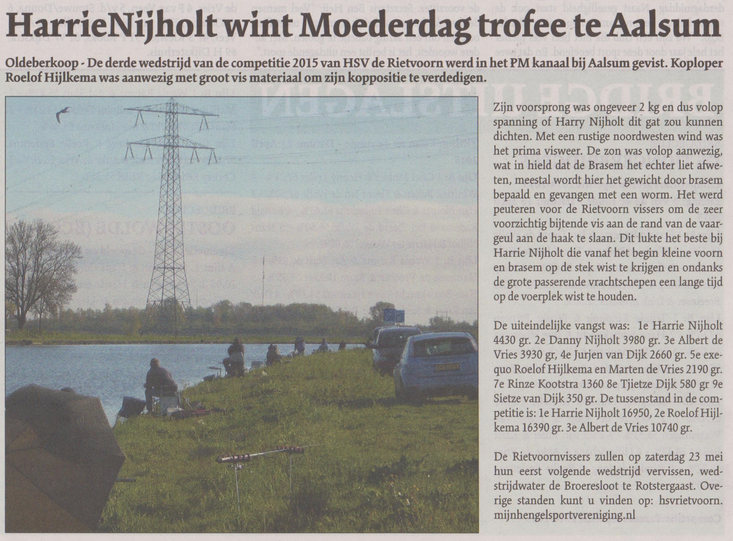 Zijn voorsprong was ongeveer 2 kg en dus volop spanning of Harry Nijholt dit gat zou kunnen dichten. Met een rustige noordwesten wind was het prima visweer. De zon was volop aanwezig, wat in hield dat de Brasem het echter liet afweten, meestal wordt hier het gewicht door brasem bepaald en gevangen met een worm. Het werd peuteren voor de Rietvoorn vissers om de zeer voorzichtig bijtende vis aan de rand van de vaargeul aan de haak te slaan. Dit lukte het beste bij Harrie Nijholt die vanaf het begin kleine voorn en brasem op de stek wist te krijgen en ondanks de grote passerende vrachtschepen een lange tijd op de voerplek wist te houden. De uiteindelijke vangst was: 1e Harrie Nijholt 4430 gr. 2e Danny Nijholt 3980 gr. 3e Albert de Vries 3930 gr, 4e Jurjen van Dijk 2660 gr. 5e exequo Roelof Hijlkema en Marten de Vries 2190 gr. 7e Rinze Kootstra 1360 8e Tjietze Dijk 580 gr 9e Sietze van Dijk 350 gr. De tussenstand in de competitie is: 1e Harrie Nijholt 16950, 2e Roelof Hijlkema 16390 gr. 3e Albert de Vries 10740 gr. De Rietvoornvissers zullen op zaterdag 23 mei hun eerst volgende wedstrijd vervissen, wedstrijdwater de Broeresloot te Rotstergaast.