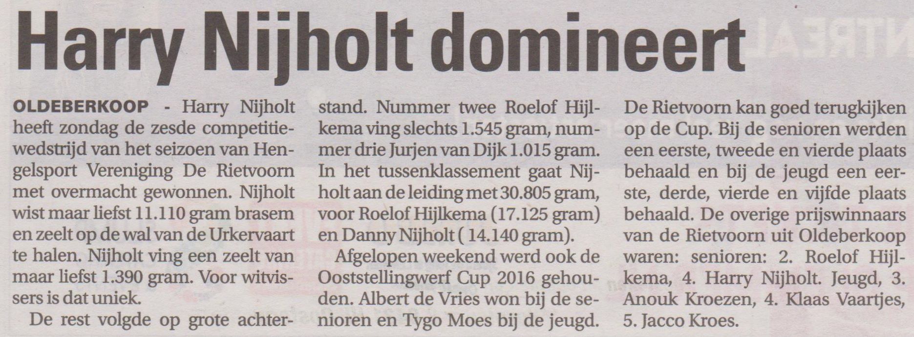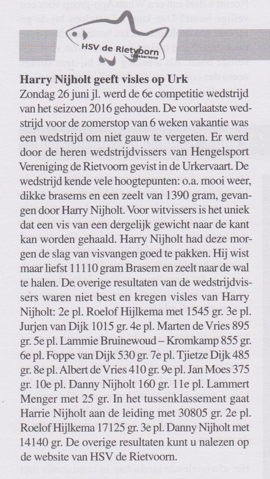 De overige resultaten van de wedstrijdvissers waren niet best en kregen visles van Harry Nijholt: 2e pl. Roelof Hijlkema met 1545 gr. 3e pl. Jurjen van Dijk 1015 gr. 4e pl. Marten de Vries 895 gr. 5e pl. Lammie Bruinewoud – Kromkamp 855 gr. 6e pl. Foppe van Dijk 530 gr. 7e pl. Tjietze Dijk 485 gr. 8e pl. Albert de Vries 410 gr. 9e pl. Jan Moes 375 gr. 10e pl. Danny Nijholt 160 gr. 11e pl. Lammert Menger met 25 gr.