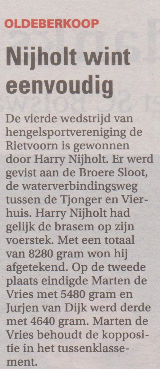Met dank aan Danny Nijholt, wie de avond voor de wedstrijd belangeloos het hele wedstrijdparcours heeft gemaaid, zodat de wedstrijd met een schone wal kon worden gestart. Met kopstek nummer had klassementsleider Marten de Vries goede papieren, echter de dikke Brasem liet hij niet in het leefnet glijden. Harry Nijholt had gelijk de Brasem op zijn voerstek, de vissen werden in rap tempo binnengehaald.