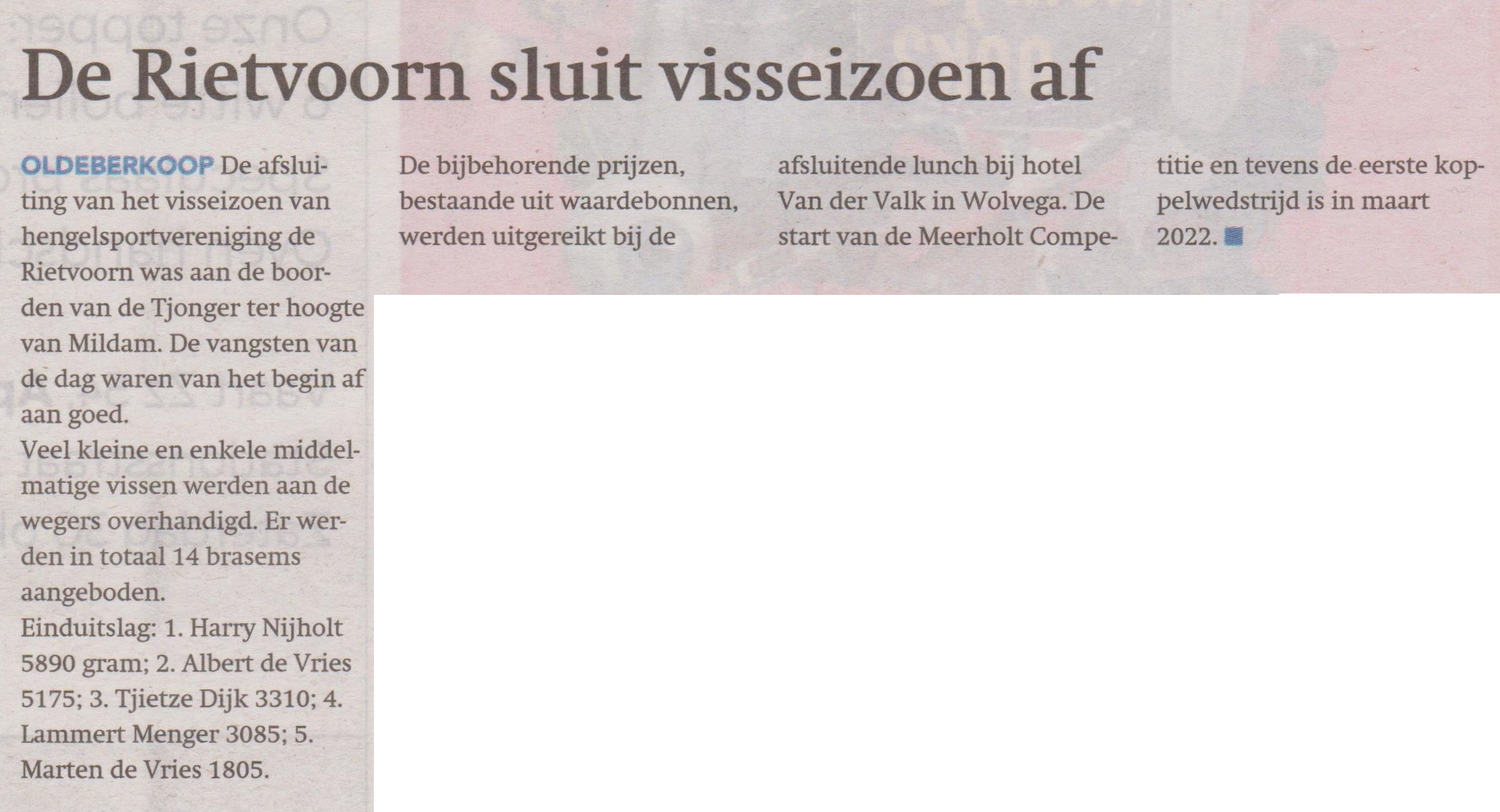 Door dat er nog laat in het seizoen gestart werd, waren de buitentemperaturen niet erg geweldig, koud weer en een Noord Westen wind kon de vissers niet weerhouden om te gaan vissen. Hoofdsponsors Meerholt en de Visvrind uit Wolvega hadden de prijzenkast gevuld met waarde cheques. De vangsten van de dag waren van het begin af aan goed, veel kleine en enkele middelmatige vissen werden aan de heren wegers overhandigd. Er werden in totaal 14 Brasems aangeboden aan de weegschaal. Om 12 uur werd de wedstrijd op ludieke wedstrijd afgeblazen en kunnen de vissers in de verdiende winterrust. De einduitslag was als volgt:1e pl. Harry Nijholt 5890 gr. 2e pl. Albert de Vries 5175 gr. 3e pl. Tjietze Dijk 3310 gr. 4e pl. Lammert Menger 3085 gr. 5e pl. Marten de Vries 1805 gr. De overige resultaten kunnen worden nagelezen op de website. De bijbehorende prijzen, bestaande uit waarde bonnen werden uitgereikt bij de afsluitende lunch in Wolvega bij de Toekan. De start van de Meerholt Competitie 2022 en tevens de eerste koppelwedstrijd is in maart 2022.