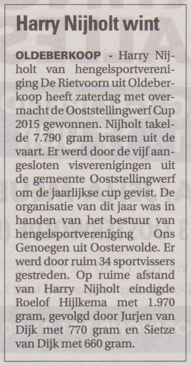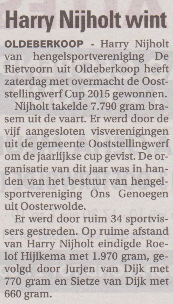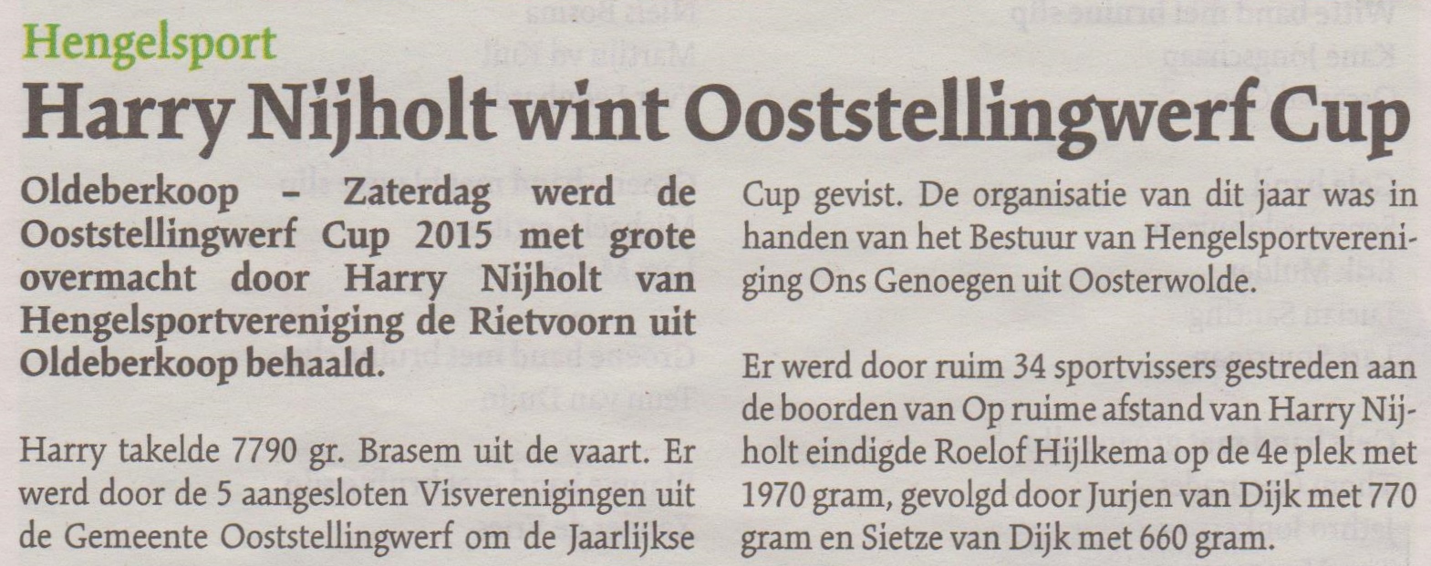 Harry takelde 7790 gr. Brasem uit de vaart. Er werd door de 5 aangesloten Visverenigingen uit de Gemeente Ooststellingwerf om de Jaarlijkse Cup gevist. De organisatie van dit jaar was in handen van het Bestuur van Hengelsportvereniging Ons Genoegen uit Oosterwolde. Er werd door ruim 34 sportvissers gestreden aan de boorden van de vaart in Appelscha. Op ruime afstand van Harry Nijholt eindigde Roelof Hijlkema op de 4e plek met 1970 gram, gevolgd door Jurjen van Dijk met 770 gram en Sietze van Dijk met 660 gram.