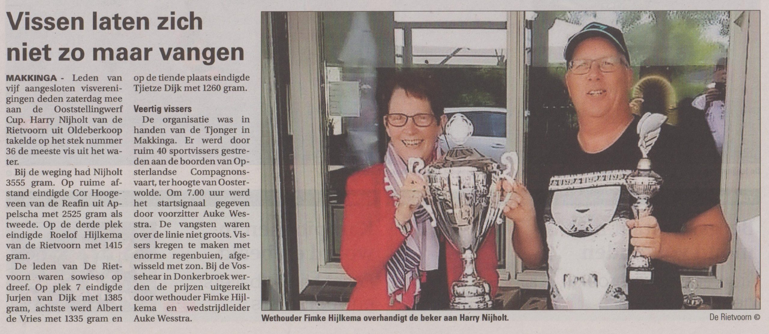 Op plek 7 eindigde Jurjen van Dijk met 1385 gram, 8e plek Albert de Vries met 1335 gram en op de 10e plaats eindigde Tjietze Dijk met 1260 gram. Allen lid van Hengelsport vereniging de Rietvoorn uit Oldeberkoop. Om 7.00 uur werd het start signaal gegeven door voorzitter Auke Wesstra en konden de deelnemers de strijd met elkaar aangaan. De vangsten waren over de linie niet groots, maar het geduld hiervoor werd voor de deelnemers ondergaan in enorme regenbuien, afgewisseld met zon. Bij het Café in Donkerbroek werden de prijzen van 2018 uitgereikt door Wethouder Fimke Hijlkema en wedstrijdleider Auke Wesstra. Mw. Hijlkema sprak de lovende woorden uit, vissen was haar onbekend maar heeft haar bemind gemaakt voor de mooie sport, uitspraak welke een sportvereniging graag hoort.