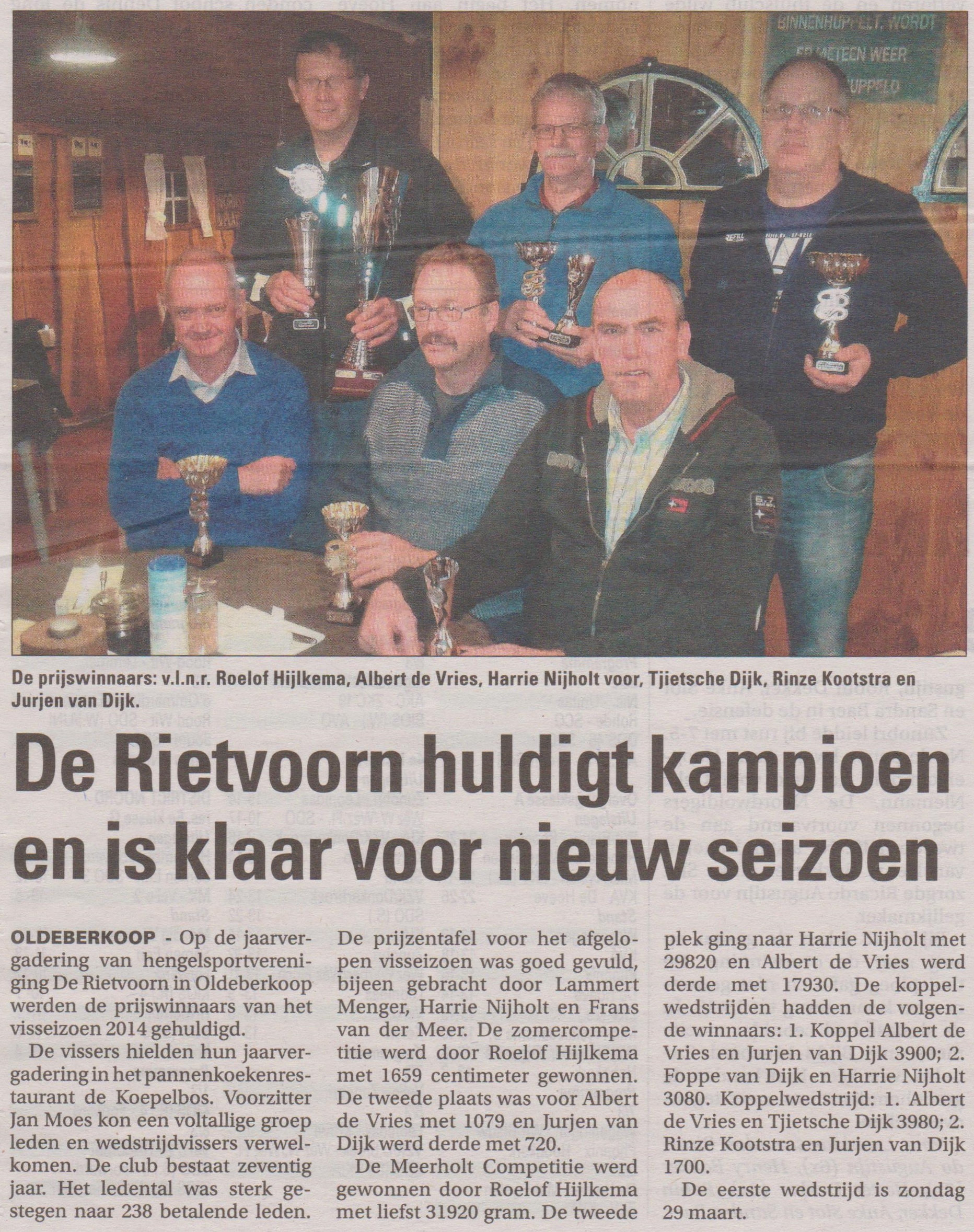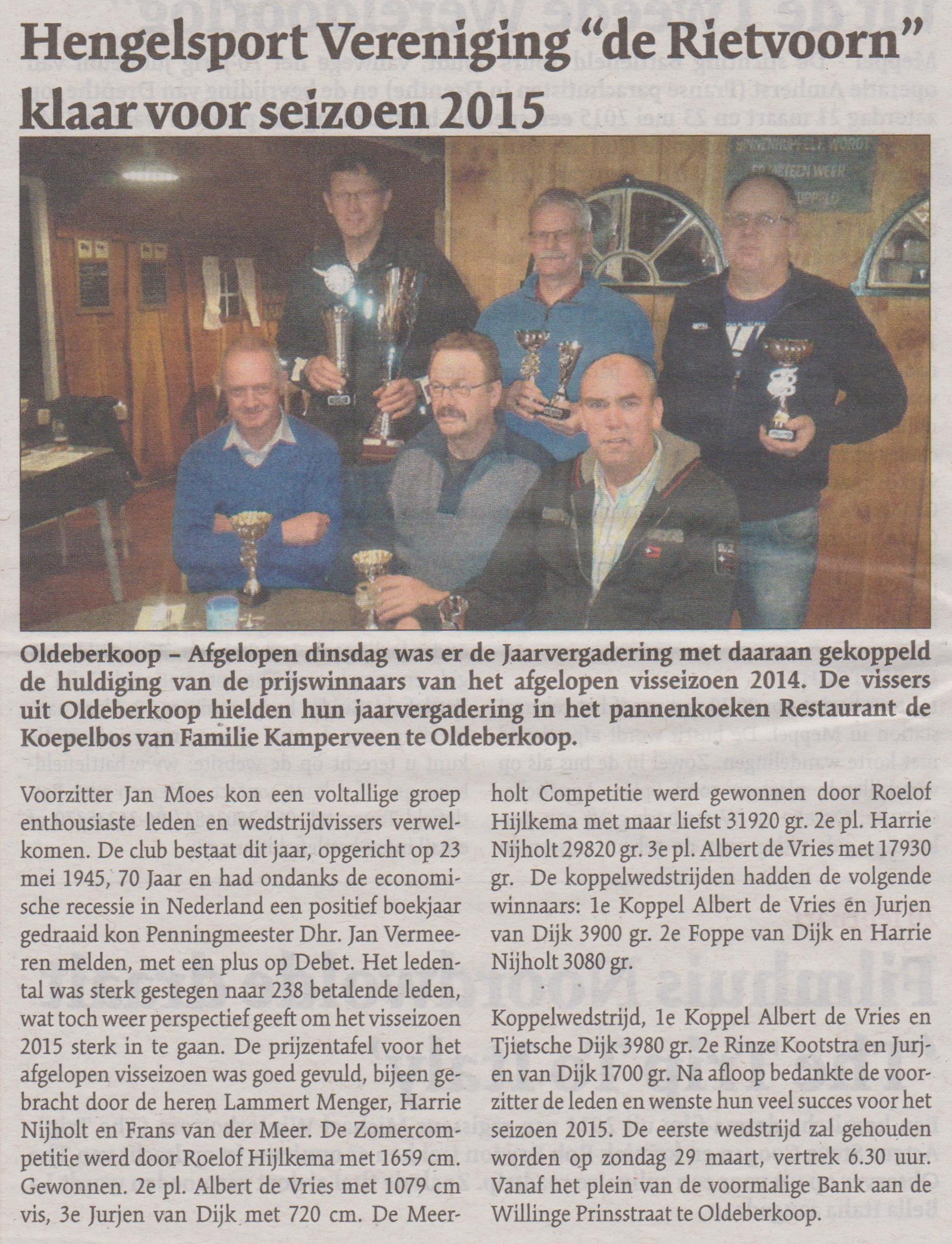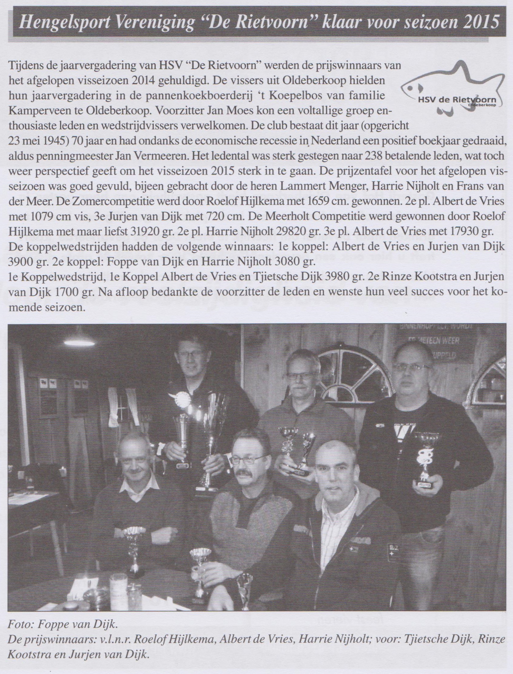 Voorzitter Jan Moes kon een voltallige groep enthousiaste leden en wedstrijdvissers verwelkomen. De club bestaat dit jaar, opgericht op 23 mei 1945, 70 Jaar en had ondanks de economische recessie in Nederland een positief boekjaar gedraaid kon Penningmeester Dhr. Jan Vermeeren melden, met een plus op Debet. Het ledental was sterk gestegen naar 238 betalende leden, wat toch weer perspectief geeft om het visseizoen 2015 sterk in te gaan. De prijzentafel voor het afgelopen visseizoen was goed gevuld, bijeen gebracht door de heren Lammert Menger, Harrie Nijholt en Frans van der Meer. De Zomercompetitie werd door Roelof Hijlkema met 1659 cm. Gewonnen. 2e pl. Albert de Vries met 1079 cm vis, 3e Jurjen van Dijk met 720 cm. De Meerholt Competitie werd gewonnen door Roelof Hijlkema met maar liefst 31920 gr. 2e pl. Harrie Nijholt 29820 gr. 3e pl. Albert de Vries met 17930 gr. De koppelwedstrijden hadden de volgende winnaars: 1e Koppel Albert de Vries en Jurjen van Dijk 3900 gr. 2e Foppe van Dijk en Harrie Nijholt 3080 gr. 1e Koppelwedstrijd, 1e Koppel Albert de Vries en Tjietsche Dijk 3980 gr. 2e Rinze Kootstra en Jurjen van Dijk 1700 gr. Na afloop bedankte de voorzitter de leden en wenste hun veel succes voor het seizoen 2015. De eerste wedstrijd zal gehouden worden op zondag 29 maart, vertrek 6.30 uur. Vanaf het plein van de voormalige Bank aan de Willinge Prinsstraat te Oldeberkoop.