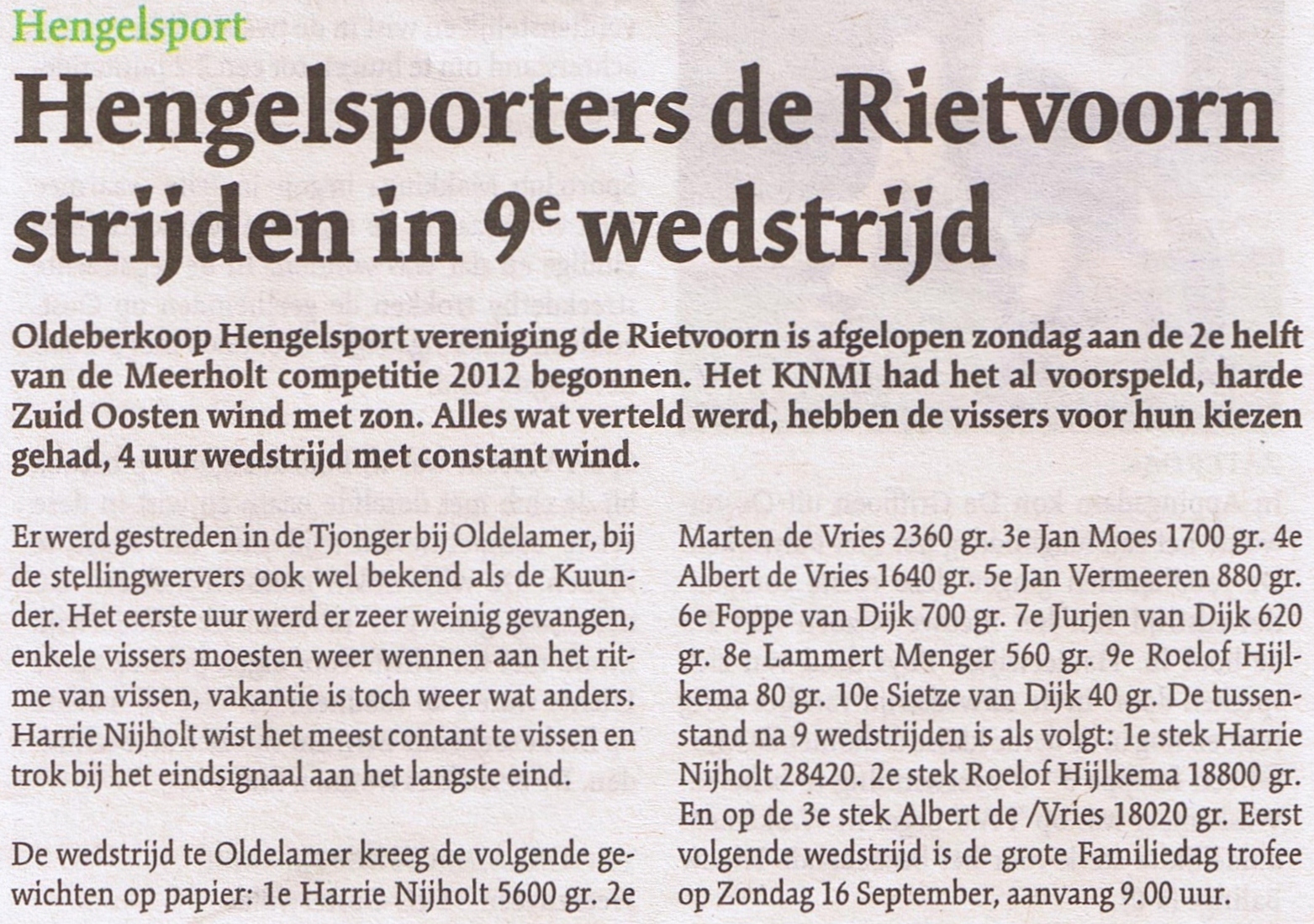 Het KNMI had het al voorspeld, harde Zuid Oosten wind met zon. Alles wat verteld werd, hebben de vissers voor hun kiezen gehad, 4 uur wedstrijd met constant wind. Er werd gestreden in de Tjonger bij Oldelamer, bij de stellingwervers ook wel bekend als de Kuunder. Het eerste uur werd er zeer weinig gevangen, enkele vissers moesten weer wennen aan het ritme van vissen, vakantie is toch weer wat anders. Harrie Nijholt wist het meest contant te vissen en trok bij het eindsignaal aan het langste eind. De wedstrijd te Oldelamer kreeg de volgende gewichten op papier: 1e Harrie Nijholt 5600 gr. 2e Marten de Vries 2360 gr. 3e Jan Moes 1700 gr. 4e Albert de Vries 1640 gr. 5e Jan Vermeeren 880 gr. 6e Foppe van Dijk 700 gr. 7e Jurjen van Dijk 620 gr. 8e Lammert Menger 560 gr. 9e Roelof Hijlkema 80 gr. 10e Sietze van Dijk 40 gr. De tussenstand na 9 wedstrijden is als volgt: 1e stek Harrie Nijholt 28420. 2e stek Roelof Hijlkema 18800 gr. En op de 3e stek Albert de /Vries 18020 gr. Eerst volgende wedstrijd is de grote Familiedag trofee op Zondag 16 September, aanvang 9.00 uur.