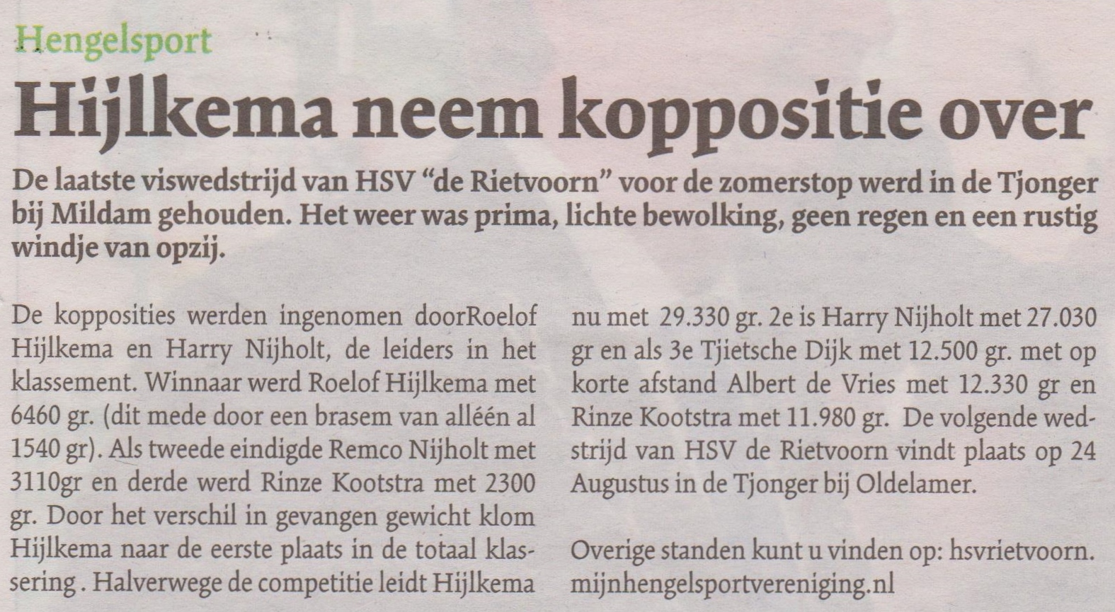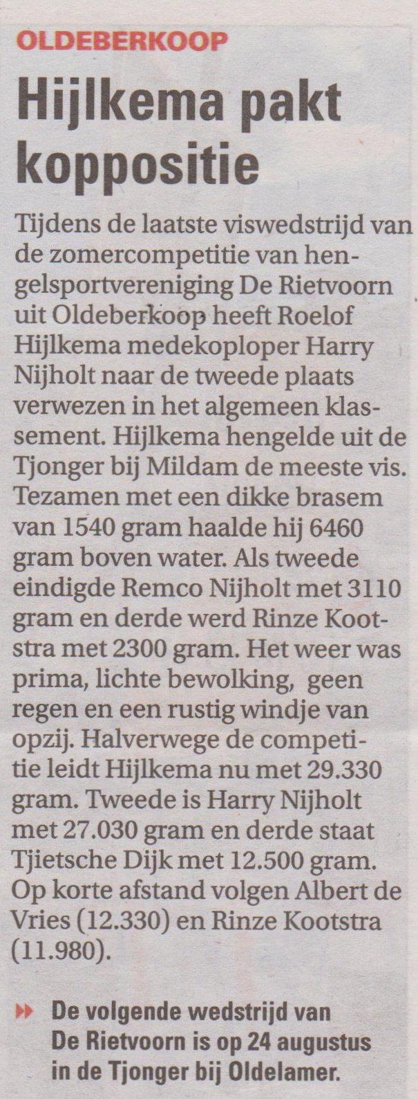 Door het verschil in gevangen gewicht klom Hijlkema naar de eerste plaats in de totaal klassering . Halverwege de competitie leidt Hijlkema nu met 29.330 gr. 2e is Harry Nijholt met 27.030 gr en als 3e Tjietsche Dijk met 12.500 gr. met op korte afstand Albert de Vries met 12.330 gr en Rinze Kootstra met 11.980 gr. De volgende wedstrijd van HSV de Rietvoorn vindt plaats op 24 Augustus in de Tjonger bij Oldelamer. Overige standen kunt u vinden op: hsvrietvoorn.mijnhengelsportvereniging.nl