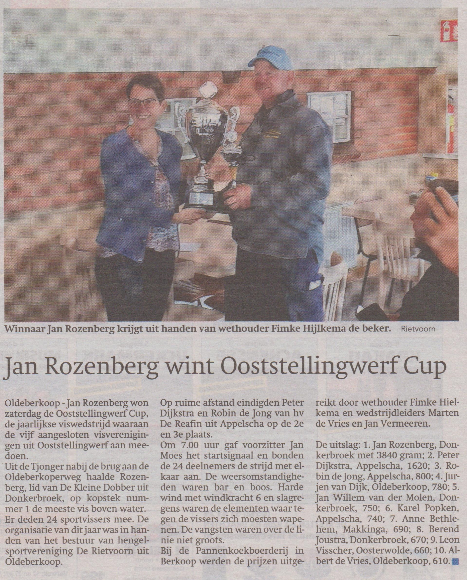 De uitslag met bijbehorende Bekers is als volgt: 1. Jan Rozenberg, Donkerbroek met 3840 gr. 2. Peter Dijkstra, Appelscha met 1620 gr. 3. Robin de Jong, Appelscha met 800 gr. 4. Jurjen van Dijk, Oldeberkoop met 780 gr. 5. Jan Willem van der Molen, Donkerbroek met 750 gr. 6 Karel Popken, Appelscha met 740 gr. 7. Anne Bethlehem, Makkinga met 690 gr. 8. Berend Joustra, Donkerbroek met 670 gr. 9. Leon Visscher, Oosterwolde met 660 gr. 10 Albert de Vries, Oldeberkoop met 610 gr. Na afloop werden de diverse sponsoren bedankt voor hun financiële bijdrage aan deze mooie en goed georganiseerde Visdag 2019. De overige resultaten van de deelnemers en foto’s kunnen worden nagekeken op de Website van visclub de Rietvoorn, http:hsvrietvoorn.mijnhengelsportvereniging.nl