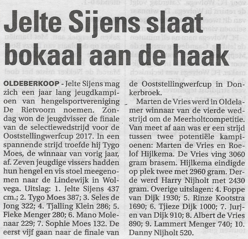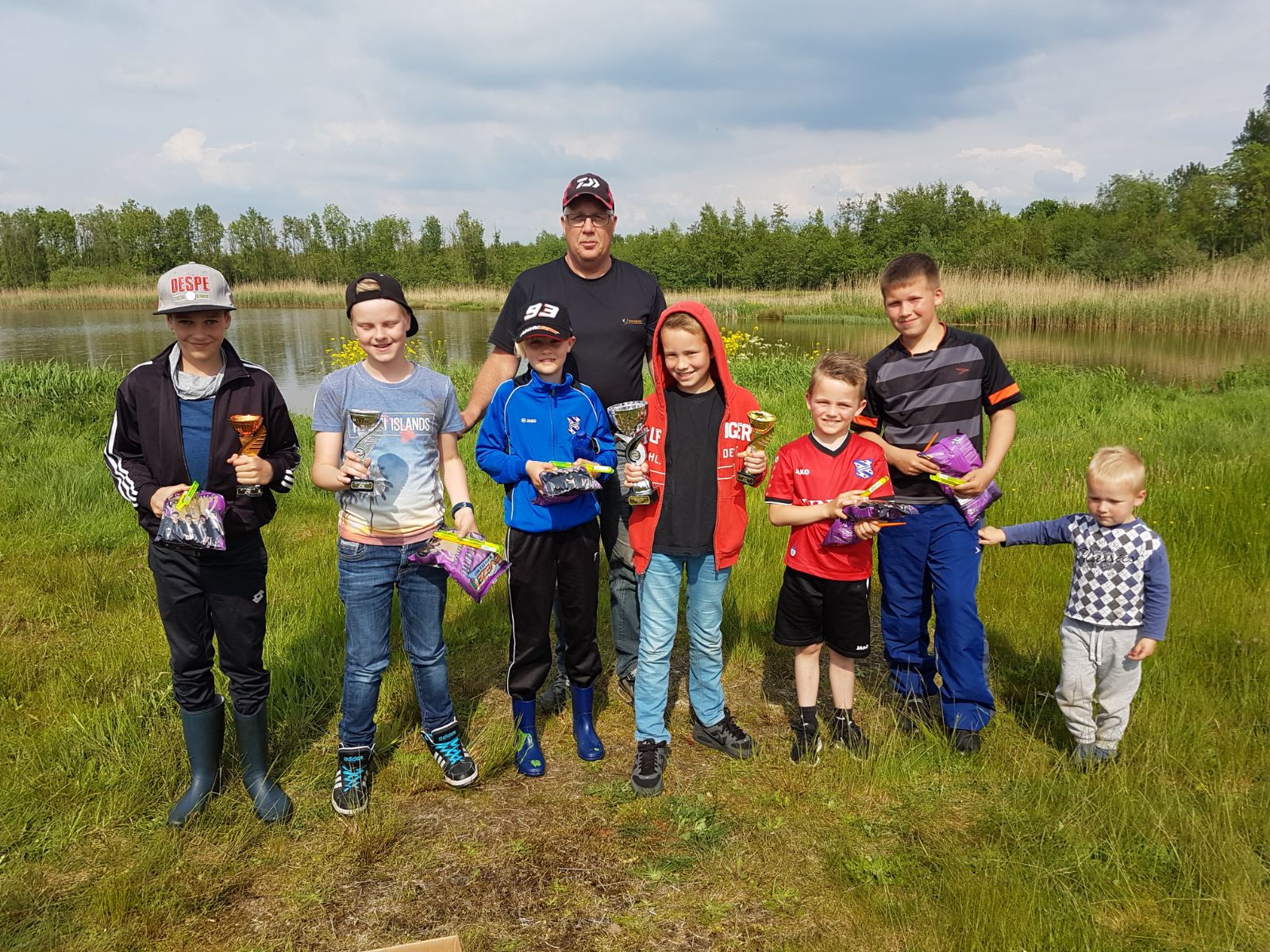 Sponsor Harrie Nijholt, Lammert Menger en Frans van der Meer hadden gezorgd voor mooie prijzen. Er moesten keuzes gemaakt worden, 7 vissertjes uit Oldeberkoop en omgeving hadden hun hengel en vis stoel meegenomen naar het mooie visplekje in Wolvega, de Lindewijk. Alle ingrediënten voor een mooie vismiddag waren aanwezig, zon, een briesje en een mooie visstek waren aanwezig. De jeugd had er zin aan en de vis liet zich dan ook veelvuldig zien aan het aangeboden aas van de jonge garde vissers. Er werd gestreden om centimeters. Van meet af aan ontspon zich in felle strijd tussen Jelte Sijens en Tygo Moes, Tygo lag een straat lengte voor, maar Jelte werd door goede concentratie en begeleiding steeds meer kandidaat voor de titel.