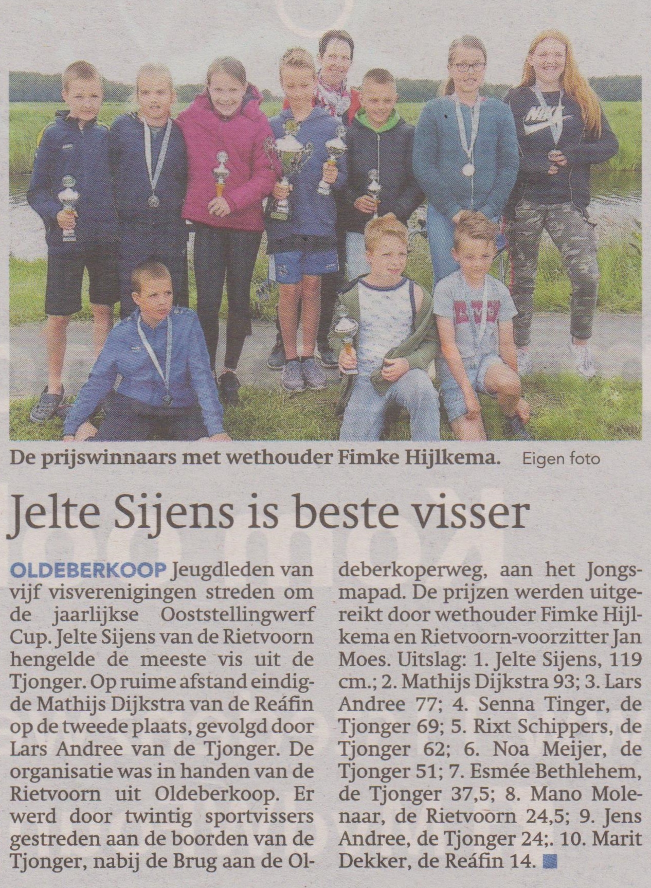 De uitslag met bijbehorende Bekers en wisselbeker is als volgt: 1. Jelte Sijens, Hsv de Rietvoorn 119 cm. 2. Mathijs Dijkstra, Hsv de Reáfin 93 cm 3. Lars Andree, Hsv de Tjonger 77 cm. 4. Senna Tinger, Hsv de Tjonger 69 cm 5. Rixt Schippers, Hsv Tjonger 62 cm. 6. Noa Meijer, Hsv de Tjonger 51 cm. 7. Esmée Bethlehem, Hsv de Tjonger 37,5 cm. 8. Mano Molenaar, Hsv de Rietvoorn 24,5 cm. 9. Jens Andree, Hsv de Tjonger 24 cm. 10. Marit Dekker, Hsv de Reáfin 14 cm. Na afloop werden de diverse sponsoren bedankt voor hun financiële bijdrage aan deze mooie en goed georganiseerde Visdag 2019.