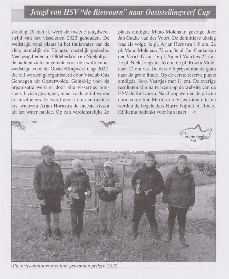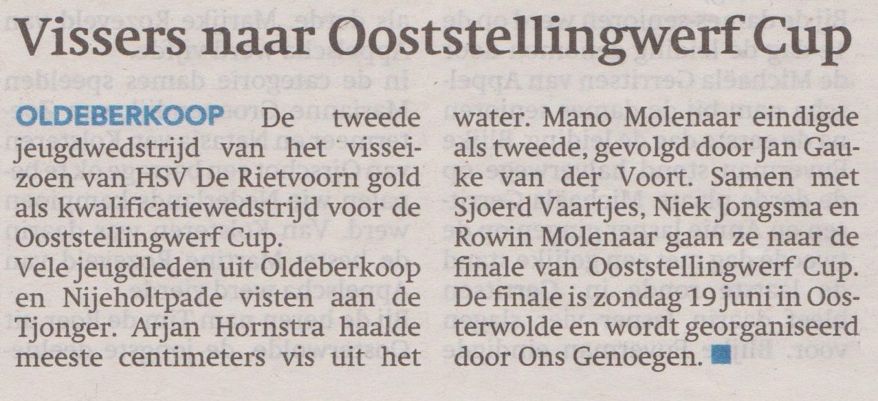 Gelukkig voor de organisatie werd er door alle vissertjes minstens 1 visje gevangen, maar zoals als altijd waren er uitschieters. Er werd gevist om centimeters vis, waarvan Arjan Hornstra er de meeste vissen uit het water haalde. Op een verdienstelijke 2e plaats eindigde Mano Molenaar, gevolgd door Jan Gauke van der Voort. De definitieve uitslag was als volgt: 1e pl. Arjan Hornstra 118 cm, 2e pl. Mano Molenaar 72 cm, 3e pl. Jan Gauke van der Voort 47 cm 4e pl. Sjoerd Vaartjes 25 cm. 5e pl. Niek Jongsma 16 cm, 6e pl. Rowin Molenaar 12 cm vis De eerste 6 prijswinnaars gaan naar de grote finale. Op de 1e reserve plaats eindigde Nora Vaartjes met 11 cm. de overige resultaten zijn na te lezen op de website van de HSV de Rietvoorn. De grote Finale in Oosterwolde om de Ooststellingwerf Cup is zondag 19 Juni vertrek om 8.00 uur bij school de Tjongeling in Oldeberkoop. Aanvang wedstrijd 9.00 uur, einde wedstrijd11.00. Na afloop werden de prijzen door voorzitter Marten de Vries uitgereikt en werden de begeleiders Harry Nijholt en Roelof Hijlkema bedankt voor hun inzet.