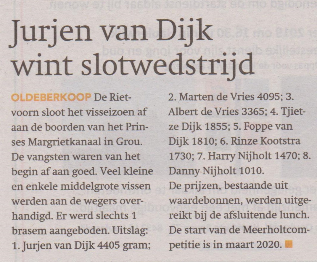 De einduitslag was als volgt:1e pl. Jurjen van Dijk 4405 gr. 2e pl. Marten de Vries 4095 gr. 3e pl. Albert de Vries 3365 gr. 4epl. Tjietze Dijk 1855 gr. 5e pl. Foppe van Dijk 1810 gr. 6e pl. Rinze Kootstra 1730 gr. 7e pl. Harry Nijholt 1470 gr. 8e pl. Danny Nijholt 1010 gr. De overige resultaten kunnen worden nagelezen op de website.