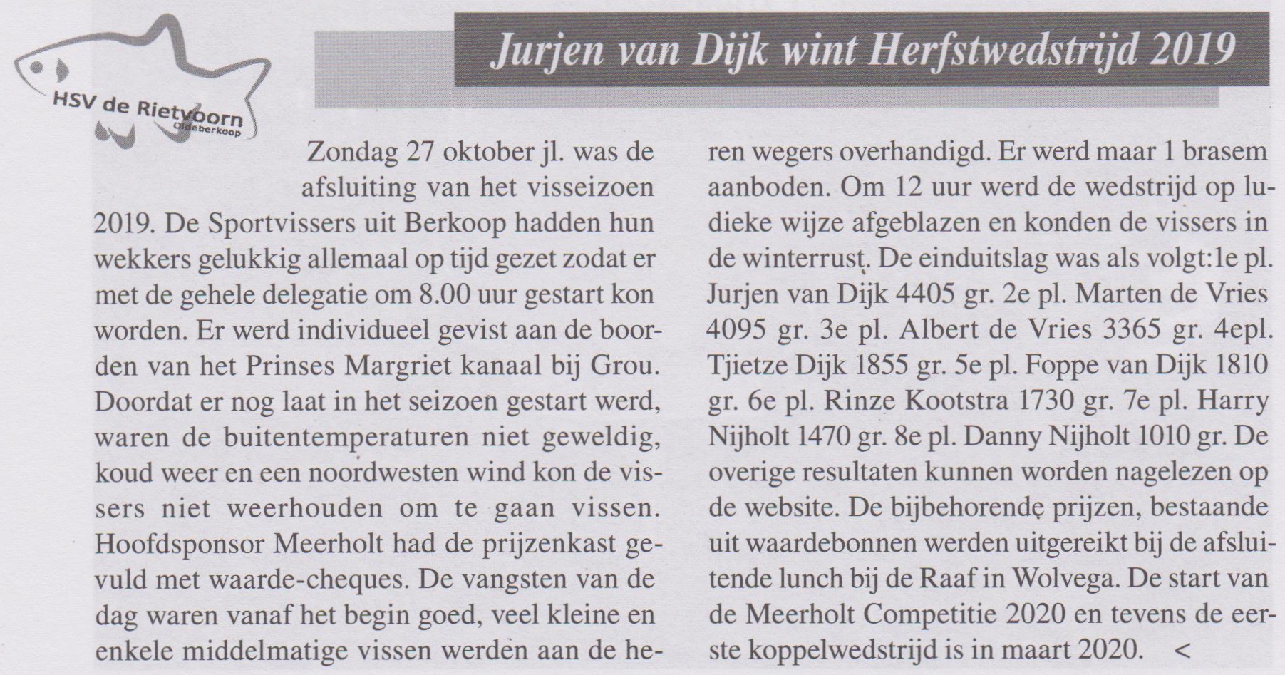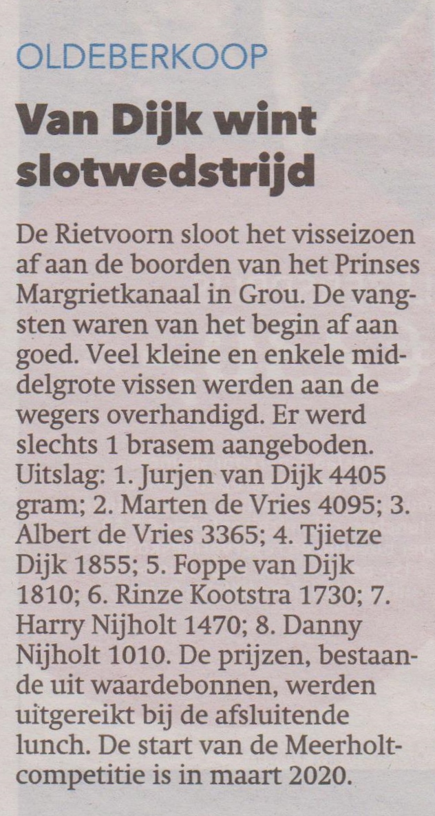 Door dat er nog laat in het seizoen gestart werd, waren de buitentemperaturen niet erg geweldig, koud weer en een Noord Westen wind kon de vissers niet weerhouden om te gaan vissen. Hoofdsponsor Meerholt had de prijzenkast gevuld met waarde cheques. De vangsten van de dag waren van het begin af aan goed, veel kleine en enkele middelmatige vissen werden aan de heren wegers overhandigd. Er werd maar 1 Brasem aanboden aan de weegschaal. Om 12 uur werd de wedstrijd op ludieke wedstrijd afgeblazen en kunnen de vissers in de winterrust.