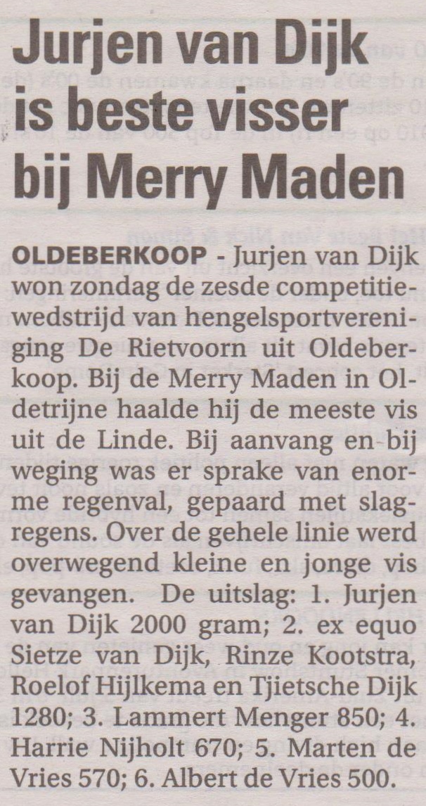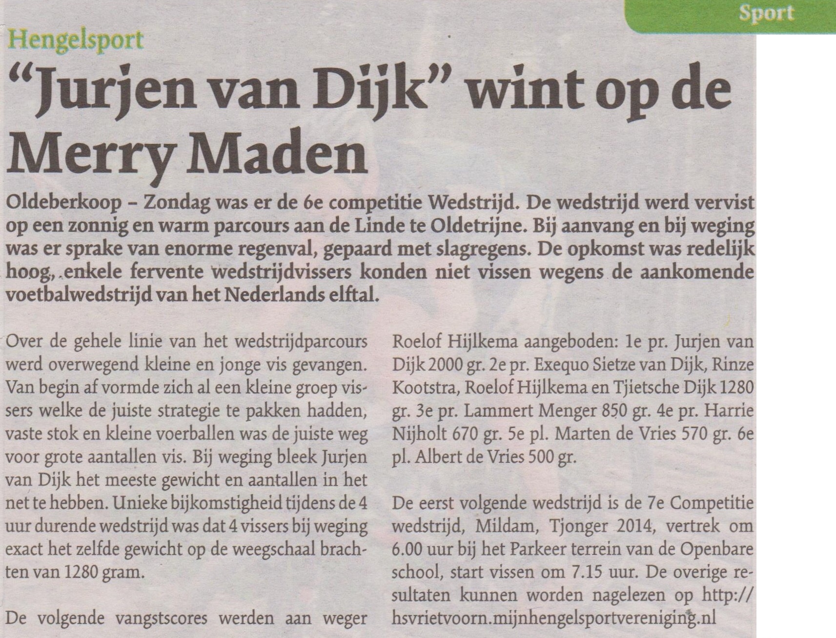 Bij aanvang en bij weging was er sprake van enorme regenval, gepaard met slagregens. De opkomst was redelijk hoog, enkele fervente wedstrijdvissers konden niet vissen wegens de aankomende voetbalwedstrijd van het Nederlands elftal. Over de gehele linie van het wedstrijdparcours werd overwegend kleine en jonge vis gevangen. Van begin af vormde zich al een kleine groep vissers welke de juiste strategie te pakken hadden, vaste stok en kleine voerballen was de juiste weg voor grote aantallen vis. Bij weging bleek Jurjen van Dijk het meeste gewicht en aantallen in het net te hebben. Unieke bijkomstigheid tijdens de 4 uur durende wedstrijd was dat 4 vissers bij weging exact het zelfde gewicht op de weegschaal brachten van 1280 gram. De volgende vangstscores werden aan weger Roelof Hijlkema aangeboden: 1e pr. Jurjen van Dijk 2000 gr. 2e pr. Exequo Sietze van Dijk, Rinze Kootstra, Roelof Hijlkema en Tjietsche Dijk 1280 gr. 3e pr. Lammert Menger 850 gr. 4e pr. Harrie Nijholt 670 gr. 5e pl. Marten de Vries 570 gr. 6e pl. Albert de Vries 500 gr. De eerst volgende wedstrijd is de 7e Competitie wedstrijd, Mildam, Tjonger 2014, vertrek om 6.00 uur bij het Parkeer terrein van de Openbare school, start vissen om 7.15 uur. De overige resultaten kunnen worden nagelezen op http://hsvrietvoorn.mijnhengelsportvereniging.nl