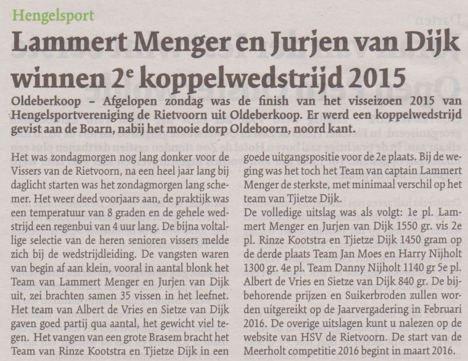 De volledige uitslag was als volgt: 1e pl. Lammert Menger en Jurjen van Dijk 1550 gr. vis 2e pl. Rinze Kootstra en Tjietze Dijk 1450 gram op de derde plaats Team Jan Moes en Harry Nijholt 1300 gr. 4e pl. Team Danny Nijholt 1140 gr 5e pl. Albert de Vries en Sietze van Dijk 840 gr. De bijbehorende prijzen en Suikerbroden zullen worden uitgereikt op de Jaarvergadering in Februari 2016. De overige uitslagen kunt u nalezen op de website van HSV de Rietvoorn. De start van de Meerholt competitie 2016 begint in maart 2016.
