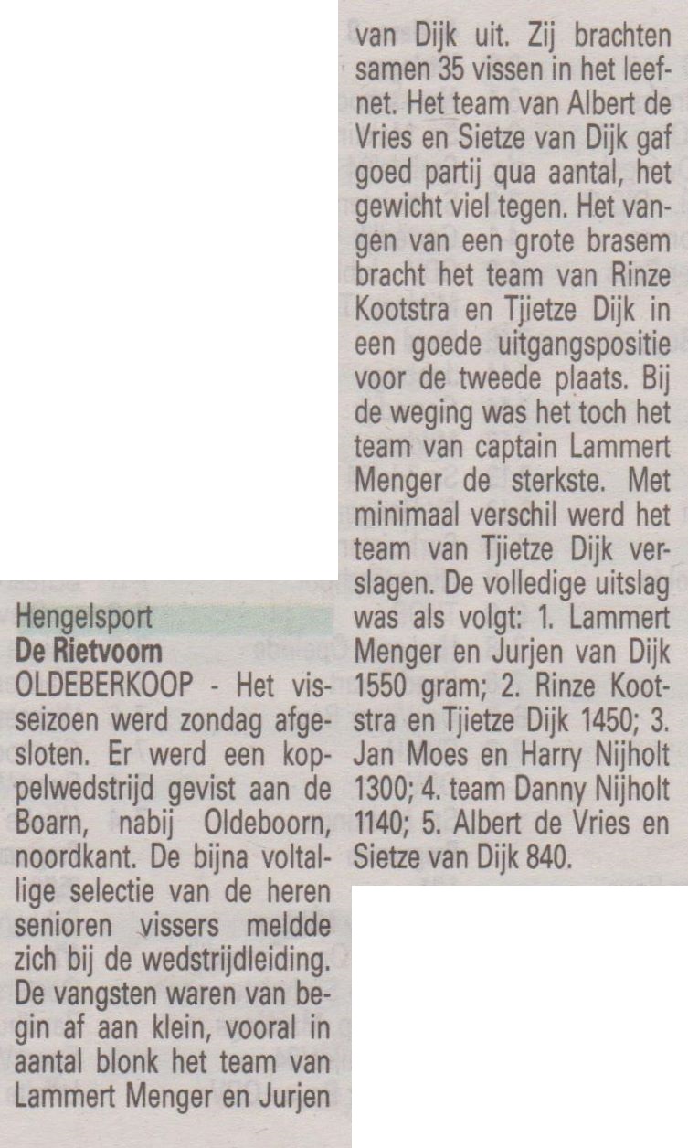 De bijna voltallige selectie van de heren senioren vissers melde zich bij de wedstrijdleiding. De vangsten waren van begin af aan klein, vooral in aantal blonk het Team van Lammert Menger en Jurjen van Dijk uit, zei brachten samen 35 vissen in het leefnet. Het team van Albert de Vries en Sietze van Dijk gaven goed partij qua aantal, het gewicht viel tegen. Het vangen van een grote Brasem bracht het Team van Rinze Kootstra en Tjietze Dijk in een goede uitgangspositie voor de 2e plaats. Bij de weging was het toch het Team van captain Lammert Menger de sterkste, met minimaal verschil op het team van Tjietze Dijk.