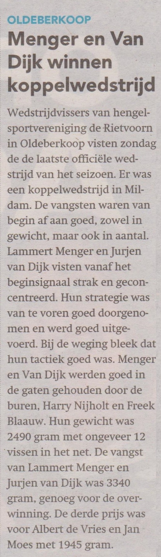 Het weer deed lekker najaars aan, de praktijk was temperatuur 14 graden, een lichte bries en vele zonnestralen. De opkomst was een positief ingestelde groep heren senioren, welke zich melden bij de wedstrijdleiding. De vangsten waren van begin af aan goed, zowel in gewicht, maar in aantal nog beter. Het team van Lammert Menger en mede koppelgenoot Jurjen van Dijk visten vanaf het beginsignaal strak en geconcentreerd, hun strategie was van te voren goed doorgenomen en werd goed uitgevoerd. Bij de weging bleek dat hun tactiek goed was. De heren werden goed in de gaten gehouden door de buren, Harry Nijholt en Freek Blaauw, hun gewicht was 2490 gram met ongeveer 12 vissen in het net. De vangst van Lammert Menger en Jurjen van Dijk was 3340 gram, dit zou na afloop genoeg blijken te zijn voor de dagoverwinning. De 3e prijs was voor Albert de Vries en Jan Moes met 1945 gram. De overige resultaten staan op de website. De start van de Herfst wedstrijd 2022 zal zijn op zondag 23 Oktober, vertrek 7.00 uur van de Carpoolplaats in Oldeberkoop. Na afloop zal de prijsuitreiking seizoen 2022 onder het genot van een etentje gaan plaats vinden.