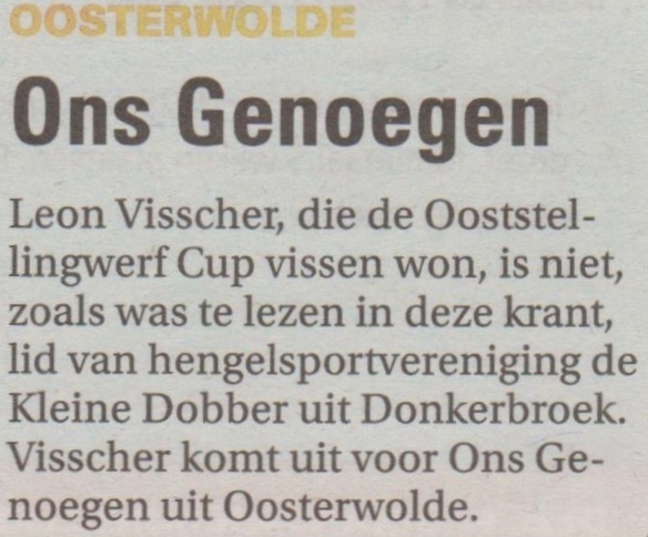 Er werd door ruim 30 sportvissers gestreden aan de boorden van de Tjonger, nabij de Brug aan de Oldeberkoperweg. Leon Visscher van de Kleine Dobber uit Donkerbroek takelde op het kopstek nummer 1 de meeste vis uit het water. Op ruime afstand eindigden Roelof Hijlkema met 1570 gram en Danny Nijholt met 1400 gram op de 2e en 3e plaats. Beiden zijn lid van de organiserende vereniging, HSV de Rietvoorn. Om 7.00 uur werd het start signaal gegeven door voorzitter Jan Moes en konden de deelnemers de strijd met elkaar aangaan. De vangsten waren over de linie niet groots, maar het geduld hiervoor werd voor de deelnemers opgevangen met Worst en Kaas, verzorgd door vrijwilliger Jan Vermeeren, van de plaatselijke VBS. Bij de Pannenkoekboerderij in Berkoop werden de prijzen van 2014 uitgereikt door Wethouder Sierd de Boer en wedstrijdleider Albert de Vries. De heer de Boer sprak in zijn speech, dat verenigingen zuinig moesten zijn op hun vrijwilligers, het word in deze tijd steeds moeilijker om de verenigingen draaiende te houden en maakte zich er zelf dan ook sterk voor om jaarlijks de aanvragen te honoreren om bij de Kampioenschappen aanwezig te kunnen zijn. De uitslag met bijbehorende Bekers is als volgt: 1. Leon Visscher 2640 gr. 2. Roelof Hijlkema 1570 gr. 3. Danny Nijholt 1400 gr. 4. Peter Dijkstra 970 gr. 5. Tjietsche Dijk 570 gr. 6. Ronnie Woldman 310 gr. 7. Gerrit Hoogeveen 290 gr. 8. Gradus Schievink 220 gr. 9. Frans de Boer 210 gr. 10. Wietze Hoogeveen 170 gr. Na afloop werden de diverse sponsoren bedankt voor hun financiële bijdrage aan deze mooie en goed georganiseerde Visdag 2014. De overige resultaten van de deelnemers kunnen worden nagelezen op de Website van visclub de Rietvoorn, hsvrietvoorn.mijnhengelsportvereniging.nl